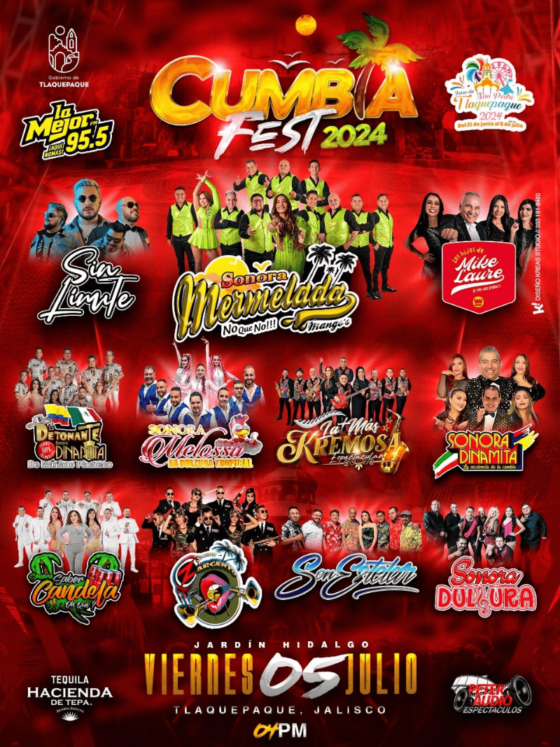 El 21 de junio, el Gobierno de Tlaquepaque inauguró la Feria de San Pedro Tlaquepaque, un evento que se extenderá por 18 días y contará con música local y actuaciones de grupos reconocidos, además de espectáculos infantiles y de comedia.El gobierno informó que ha preparado una serie de eventos extraordinarios que, además de ser sin costo, ofrecerán a las familias de esta localidad y de municipios cercanos la oportunidad de disfrutar de la cultura, música, gastronomía y arte.Uno de esos eventos, previo al cierre de la Feria, es el llamado Cumbia Fest, un espectáculo musical en el que se harán presentes varias sonoras tanto famosas como locales, por ejemplo la Sonora Mermelada, que será el grupo estelar.Este evento tendrá lugar el próximo viernes 05 de julio en el Jardín Hidalgo de San Pedro Tlaquepaque a las 16:00 horas.Podrás disfrutar una tarde llena de cumbia al ritmo de las siguientes agrupaciones: No olvides que además de música, podrás disfrutar de juegos mecánicos, ventas artesanales y comerciales, una exposición ganadera y muchas sorpresas más.Y como dato interesante debes saber que estos eventos son en colaboración con la estación de radio La Mejor FM 95.5. YC