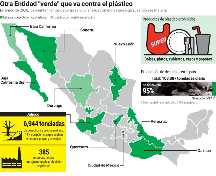 Deberán ajustarse a nueva regulación 385 fabricantes de plásticos en JaliscoSerán al menos 385 empresas que tendrán que cambiar sus procesos y materiales para la elaboración de bolsas de plástico y popotes, luego de que el Congreso del Estado aprobó prohibir, a partir de 2020, el uso de aquellos que no estén hechos con materiales biodegradables.En la iniciativa que se presentó en el Poder Legislativo se dio a conocer que son 215 empresas dedicadas a la fabricación de vajillas de plástico y 170 que producen bolsas de plástico de película, según el Directorio Estadístico Nacional de Unidades (DENUE).Para que las compañías se ajusten a los nuevos lineamientos que establecerá la Secretaría de Medio Ambiente y Desarrollo Territorial (Semadet), las autoridades estatales deberán apoyar e incentivar a los fabricantes.Serán la Semadet y la Secretaría de Innovación, Ciencia y Tecnología (Sicyt) las dependencias que tienen que realizar una norma técnica en la que se establezcan los procesos sustentables de producción, así como las características técnicas y materiales con las que deberán contar los productos realizados con calidad de biodegradables y las atribuciones de vigilancia y sanción. Los Ayuntamientos se encargarán de sancionar a los comercios que incumplan con las disposiciones.La regulación busca que dejen de comercializarse bolsas de plástico y popotes de polietileno de alta y baja densidad y de propileno virgen. Además, la autoridad deberá lanzar una campaña de difusión y concientización dirigida a la población sobre la importancia de la reducción de los plásticos de un solo uso, así como las ventajas medioambientales y para la salud al volver a utilizarlos y al sustituirlos.Aunque en realidad lo que se pretende es eliminar por completo el uso de desechables, el primer paso será incentivar la producción sostenible de plásticos y el uso de productos biodegradables. En México hay siete estados en los que está prohibido el uso de bolsas, popotes y vajillas de plástico no biodegradable, por lo que, después de que en el Congreso local se aprobaron cambios a la Ley estatal de Equilibrio Ecológico y Protección al Ambiente, se convirtió en el octavo a nivel nacional en sumarse a los cambios en pro del medio ambiente.A partir de 2020, en la Entidad no se podrán producir o comercializar bolsas de plástico o popotes que no estén hechos con materiales biodegradables. Las empresas que incumplan serán sancionadas por los gobiernos municipales.Veracruz, Querétaro, Nuevo León, Sonora, Ciudad de México, Oaxaca y Baja California Sur ya tienen cambios en sus legislaciones con el propósito de eliminar el consumo de desechables.En Querétaro, por ejemplo, este año entró en vigor la ley que señala que los negocios en los que se usen bolsas de plástico serán amonestados o sancionados con multas que van de los cuatro mil a los 300 mil pesos, dependiendo el tamaño del establecimiento. Además, la autoridad municipal también les puede retirar la licencia.En Nuevo León se restringió la venta, dádiva y uso de bolsas de plástico que no tengan como mínimo 30% de material reciclado y una ágil degradación, de acuerdo con la Norma Oficial Mexicana NMX-E-267.En Veracruz y Querétaro se prohibió de manera gradual. En la Ciudad de México tienen 10 años con esa reglamentación.En Oaxaca, la regulación se da sólo a nivel municipal, ya que son sólo algunos ayuntamientos en los que se acordó no usar bolsas de plástico. Entre ellos están San Bartolo Coyotepec y Teotitlán del Valle.En Baja California y Durango está en proceso una iniciativa al respecto.De acuerdo con los datos más recientes del Instituto Nacional de Estadística y Geografía (Inegi), en México se producen diariamente 103 mil 887 toneladas de residuos sólidos urbanos, y sólo 5% de éstos se recicla. Lo peor es que sólo una minúscula fracción de ese material reciclado es plástico: 0.5 por ciento. En Jalisco son seis mil 944 toneladas de desechos, y 13 de cada 100 de esos kilos son plásticos que terminan en rellenos sanitarios, mares, playas, drenajes y alcantarillas.