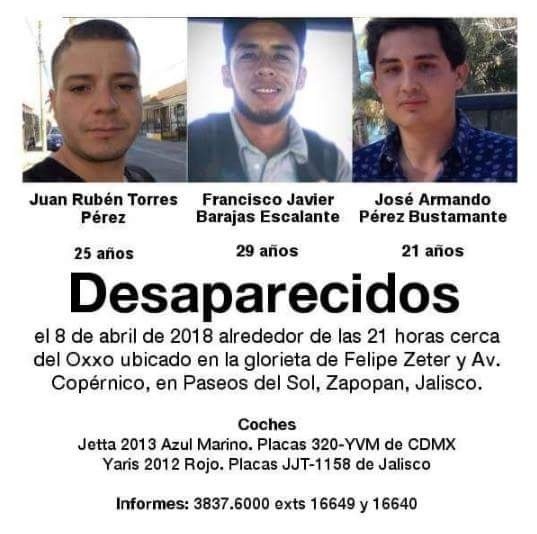 El presidente de la Federación de Estudiantes Universitarios (FEU), Jesús Medina, informó esta tarde sobre la desaparición de tres jóvenes en el estado; uno de ellos, estudiante de la licenciatura de Economía de la Universidad de Guadalajara (UdeG).Se trata de Jorge Armando Pérez Bustamante de 21 años de edad, estudiante de la UdeG, quien iba acompañado de sus vecinos Juan Rubén Torres Pérez y Francisco Javier Barajas Escalante, de quienes se desconoce su paradero actual, todos vecinos de la colonia Paseos del Sol en Zapopan. Autoridades precisaron que la última comunicación que tuvieron los familiares con estos jóvenes fue alrededor de las 22:15 horas del domingo 8 de abril.Medina aseguró que las denuncias correspondientes ya fueron puestas ante la Fiscalía del Estado.De acuerdo con lo explicado por el presidente de la FEU, según relataron los familiares, los jóvenes se habrían puesto de acuerdo para ir al cine a una función de las 21:00 horas, al parecer a un centro comercial ubicado al sur de la ciudad, sin embargo se desconoce si asistieron a la misma.Además, se encuentran sin localizar dos vehículos en los que viajaban los jóvenes, un Wolkswaguen Jetta color azul y un Toyota Yaris del cual no se mencionó el color; ambos propiedad de los padres de los ahora desaparecidos.Por su parte la Comisión Estatal de Derechos Humanos Jalisco (CEDHJ) informó que ya fue abierta un acta de investigación bajo el número 58/2018/IV por la desaparición de los jóvenes, a la cual se agregará la información que familiares puedan aportar para las indagaciones pertinentes.La CEDHJ explicó además, que se brindará a las familias el apoyo y acompañamiento necesarios para el seguimiento adecuado del caso.Al respecto del tema, Medina dijo también que a partir de este martes se realizará una activación para visibilizar el problema de desapariciones en el Estado, en la que colocarán calcomanías con la leyenda '¿Dónde están?' sobre los rostros de los candidatos a cargos públicos en publicidad que se encuentre en la ciudad.