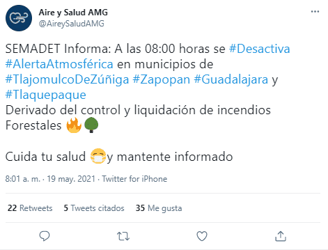 A partir de las 08:00 horas de este miércoles la Secretaría de Medio Ambiente y Desarrollo Territorial (Semadet) desactivó la Alerta Atmosférica decretada ayer martes 18 de mayo a las 21:00 horas, debido a las emisiones contaminantes generadas por incendios forestales registrados en la Zon Metropolitana de Guadalajara (ZMG).Los incendios en Cerro del Tepopote, Barranca del Muerto, Rancho Contento y Bosque el Centinela en el municipio de Zapopan; El Varal en Ixtlahuacán de los Membrillos; El Poleo en Tala, dentro del dentro del Área de Protección de Flora y Fauna (APFF) del Bosque La Primavera; y Cerro de los Bailarines en el municipio de El Arenal, se reportan como liquidados. En el Cerro del Colli, dentro del APFF Bosque La Primavera en el municipio de Zapopan, continúan los trabajos de enfriamiento ya que se reporta como controlado, explicó la Semadet.Por ello y luego de haberse comprobado que las condiciones meteorológicas favorecen la dispersión de contaminantes, la alerta se desactiva para los municipios de Guadalajara, San Pedro Tlaquepaque, Tlajomulco de Zúñiga y Zapopan, dijo la dependencia. La alerta, añadió, se activó debido a los potenciales riesgos a la salud para la población aledaña por lo que se emitieron recomendaciones en coordinación con la Secretaría de Salud de Jalisco.“La Semadet emitió recomendaciones a la ciudadanía de forma inmediata para prevenir cualquier tipo de afectaciones en materia de salud pública. Estas medidas se tomaron debido a que la mala calidad del aire provoca afectaciones a la salud, especialmente entre grupos vulnerables como: niños menores de cinco años, personas con enfermedades respiratorias crónicas y adultos mayores”, dijo a través de un comunicado.Por último, el Gobierno de Jalisco exhortó a la ciudadanía a permanecer atenta a las recomendaciones que se emitan ante este tipo de situación a través de los medios oficiales, como la cuenta de Twitter @AireySaludAMG.GC