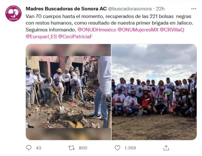 Aunque el pasado 8 de marzo las Madres Buscadoras de Sonora afirmaron que la Fiscalía de Jalisco confirmó 59 cuerpos exhumados, hoy la dependencia afirmó que como resultado de las labores de búsqueda se localizaron los cuerpos de 44 Personas Fallecidas Sin Identificar (PFSI), así como un lote de huesos que los peritos forenses dictaminaron pertenecían a un canino.La dependencia también destacó que esta cifra es preliminar y podría modificarse en los próximos días debido a que aún quedan pendientes de procesar cinco bolsas por parte del Instituto Jalisciense de Ciencias Forenses, labor que culminará en los próximos días.Hoy también, el colectivo aseguró en redes sociales que podrían ser más de 70, derivados de su primera brigada de búsqueda por la entidad.Aunque la Fiscalía señaló que las labores de búsqueda en nueve fincas a través de mandamiento judicial otorgados por el órgano jurisdiccional, así como tres predios abiertos, concluyeron en días pasados, el colectivo adelantó que aún faltan bolsas por procesar y fincas por explorar.Este viernes, Jalisco sumó 16 mil 001 personas desaparecidas y no localizadas, esto de acuerdo con el último corte del 11 de marzo del 2022 de la Comisión Nacional de Búsqueda.JM