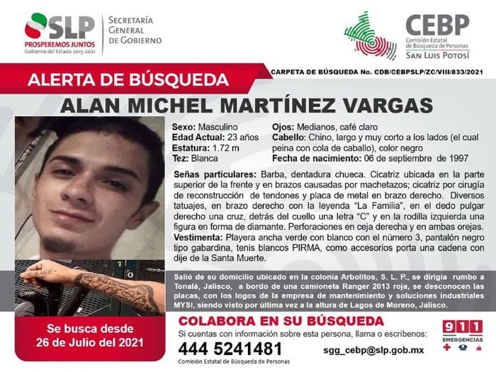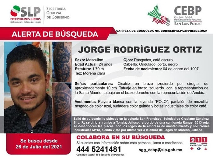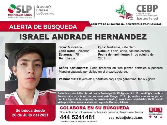 Cuatro jóvenes residentes en el estado de San Luis Potosí están desaparecidos desde el pasado 26 de julio, cuando partieron de sus domilicios rumbo a Tonalá, en Jalisco. El último lugar en que se les vio fue en el municipio jalisciense de Lagos de Moreno por lo que la Comisión Estatal de Búsqueda de Personas de San Luis Potosí (CEBP) emitió una alerta por su desaparición. La Comisión de Búsqueda de Personas de Jalisco también emitió cédulas para su búsqueda.Los jóvenes desaparecidos fueron identificados com Calep Adonai Maldonado Moncivais, de 18 años; Israel Andrade Hernández, de 20; Alan Michel Martínez Vargas, de 23, y Jorge Rodríguez Ortiz, de 24.La CEBP detalló que se trasladaban a Tonalá en una camioneta Ranger 2013 roja, cuyas placas no se conocen, la cual muestra logotipos de la empresa MYSI.En caso de tener alguna información sobre el paradero de los jóvenes, se pide llamar al 33 3145 6314 o al 444 524 1481.O bien, escribir al correo: sgg_cebp@slp.gob.mxSi te interesó esta noticia y quieres saber más, entonces descarga y descubre INFORMAPlus, la aplicación digital de EL INFORMADOR, en donde tenemos contenidos exclusivos, seleccionados por nuestros editores, para darles una experiencia más completa a los lectores. Descarga la aplicación y pruébala GRATIS por treinta días. Para iOS: https://apple.co/35jaVgbPara Android: https://bit.ly/3gwVSEVSi eres suscriptor de EL INFORMADOR tu acceso está incluido, solicítalo al 33 3678-7777IM