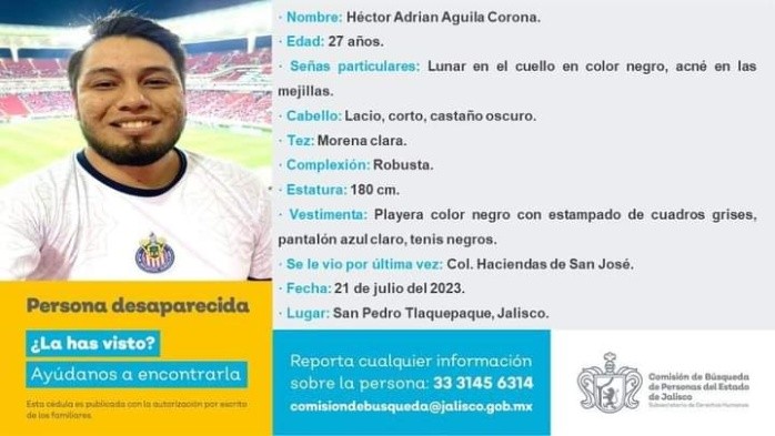 Familiares, amigos y compañeros de trabajo de un joven desaparecido el pasado 21 de julio en Tlaquepaque, se manifestaron en la avenida López Mateos a la altura de El Palomar. Los quejosos bloquearon el sentido de sur a norte, en demanda de la localización del muchacho, visto por última vez en la colonia Haciendas de San José, del municipio de San Pedro Tlaquepaque.La víctima está identificada como Héctor Adrián Aguilar Corona de 27 años de edad. Entre los manifestantes hubo empleados de la Comisión Nacional Forestal (Conafor), compañeros de trabajo de Héctor.El grupo de aproximadamente 60 personas cerró el sentido de ingreso a la ciudad. Al sitio llegaron elementos de la Policía del Estado y Policía Vial, quienes liberaron uno de los carriles para desfogar el tráfico. Hubo altercados entre manifestantes, autoridades y automovilistas molestos por el cierre de la arteria vial.Debido al cierre parcial de la vialidad, el embotellamiento llegó hasta las Plazas Outlet. Personal de la Fiscalía arribó al sitio para dialogar con los familiares del joven y liberar la circulación.“El salió de la casa de unos amigos y ahí se perdió, alguien se lo llevó en ese transcurso, atrás del ITESO y Hacienda Santa María. Ahí fue su pérdida de él. Ya encontramos su carro, sus cosas, pero él no está”, expresó la señora María Teresa Corona Navarro, madre de Héctor Adrián.Después de hora y media de bloquear López Mateos, el contingente se retiró con la promesa de personal de la Fiscalía que mañana habrá una reunión con los padres del joven en Palacio de Gobierno. Los padres del joven advirtieron que si no hay avances en las indagatorias, bloquearán de nuevo López Mateos a la misma hora este jueves.MF