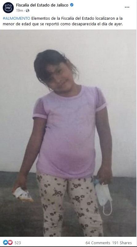 La Fiscalía del Estado de Jalisco (FE) informó hoy que elementos de la dependencia localizaron con vida a la niña de 8 años reportada ayer como desaparecida en Tlajomulco. Alrededor de las 14:00 horas del día de este viernes fue ubicada la menor Alexandra Paola Márquez Cisneros, en una finca en Colinas del Roble, además de la menor había otros tres niños.Ayer, la Fiscalía dijo que realizaba operativos de búsqueda y abrió una carpeta de investigación por la desaparición de Alexandra Paola, vista por última vez la tarde de ayer en la colonia Colinas del Roble. Además se emitió la Alerta Amber.“Se trabajó prácticamente toda la noche, en la madrugada se logró encontrar a un testigo que nos pudo dar datos preliminares y se trabajó con el testigo hasta las 4 de la mañana y posteriormente han estado surgiendo algunos datos, en este momento hay más de 200 personas de Fiscalía trabajando en la zona: Los Robles, Hacienda Santa Fe, Encinos, 10 colonias por cuadrantes”, comentó hoy el fiscal del Estado, Gerardo Octavio Solís Gómez. Antes de la localización hubo un video que le proporcionaron a la Fiscalía del Estado en el que se ve la niña de 8 años caminando, posteriormente fue encontrada.El testigo proporcionó algunos datos que apoyaron en la localización, se corroboró y jurídicamente está en calidad de testimonio.Solís Gómez destacó que en la casa ubicada en la misma colonia de donde desapareció Alejandra había otras dos niñas, de la misma edad, además de otro niño que ha caído en controversia en sus declaraciones.“Había dos pequeñitas en este momento, están muy asustadas, está un menor de edad que está muy incoherente, no hay condiciones para platicar con él. No podemos tener una entrevista directa, tiene que ser a través de un psicólogo para que se encargue de entrevistarlas de acuerdo a los protocolos y en su momento podemos sacar el detalle cierto de lo que sucedió, están muy pequeñitas las dos, entre 8 y 9 años”, dijo.En sus redes sociales, el gobernador de Jalisco destacó el trabajo coordinado de la FE para encontrar a Alexandra.“Luego de una búsqueda exhaustiva de noche y de día, por tierra y por aire, con toda la fuerza policiaca y de investigación del estado, me da mucho gusto informarles que Alexandra, la niña que ayer fue reportada como desaparecida en Tlajomulco, ha sido localizada sana y salva”, comentó el mandatario estatal en un tuit.Horas más tarde, el fiscal Gerardo Octavio Solís Gómez destacó que Alexandra era la única menor de edad que se encontraba ahí en contra de su voluntad. Los otros infantes vivían en el domicilio donde fue localizada.“Que encontramos a dos pequeñitas más o menos de su edad, entre ocho y 10 años. Son hermanitas de otro menor de aproximadamente 14 o 16 que estaban en la finca, son los moradores de la finca. Estamos hablando de un menor de 14 o 16 y dos pequeñitas, hermanos entre sí. Y ahí se encontraba esta pequeñita que estaba desaparecida”, dijo.Además de la madre de Alexandra Paola que se reencontró con su pequeña, asistió la mamá de los otros niños moradores de la vivienda.IM