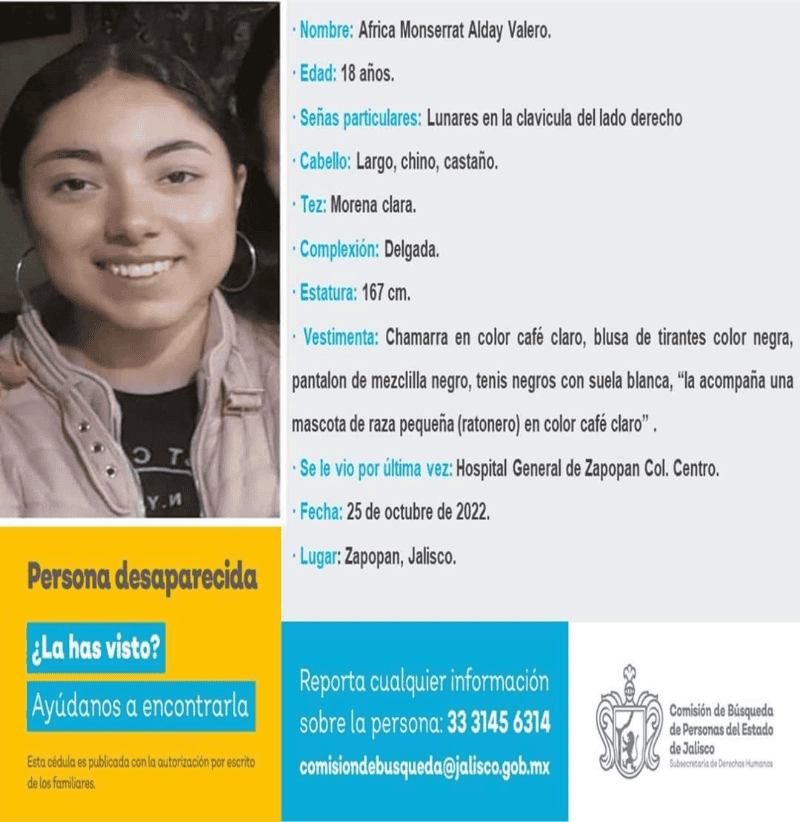 La joven África “M”, de 18 años, desaparecida desde el pasado 25 de octubre, fue localizada por personal de la Fiscalía Especial de Personas Desaparecidas (FEPD), por lo que está a disposición del área de protocolo Alba, quien se encargará de regresarla con sus familiares. Desde hace una semana, sus familiares, no tenían noticias sobre su paradero, por lo que el pasado martes fueron a presentar una denuncia en las instalaciones de la Fiscalía, en la Calle 14, en la Zona Industrial de Guadalajara.África fue vista por última vez el 25 de octubre por la zona del Hospital General de Zapopan.La FEPD realizó estrategias y operativos de búsqueda con la finalidad de la localización de la joven y durante las primeras horas de hoy miércoles fue ubicada, y según detalló la Fiscalía, se había ausentado por iniciativa propia, por lo que se descartó que fuera víctima de la comisión de un delito.Al ser localizada, la Fiscalía detalló que se aplicaron los protocolos de búsqueda, por lo que África fue resguardada de inmediato y remitida a una valoración médica, constatando que se encuentra bien de salud. Por lo que será reintegrada a su núcleo familiar.GC