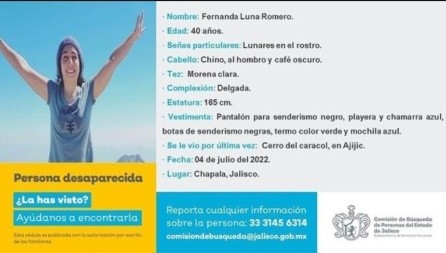 Fernanda Luna Romero, desaparecida desde el día de ayer lunes luego de haber ido a dar un paseo con su perro, “Benito”, al cerro del Caracol, en Ajijic, Jalisco, fue localizada el día de hoy. El alcalde de Chapala, Alejandro Aguirre Curiel, confirmó alrededor del mediodía de hoy que Fernanda Luna fue localizada con vida, sin embargo, no especificó cuál es su estado de salud. “Ya hemos hecho contacto verbal con la joven Fernanda Luna (...) hemos pedido apoyo a Protección Civil del Estado y Protección Civil municipal y en este momento me informan que ya tuvieron comunicación verbal con ella. Próximamente les seguiré informando cuál es la situación”, dijo Aguirre Curiel en un video publicado en redes. Según reportaron autoridades, Fernanda y su perrito fueron encontrados en un barranco, entre los cerros Mesa del Ocote y La Campanaria.Luna Romero, de 40 años, fue vista por última vez ayer en el Cerro del Caracol mientras practicaba senderismo. GC
