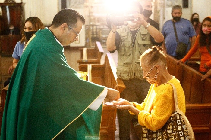 Con solo dos fieles sentados en cada banca, misma que es separada por una fila vacía, es como desde hace dos domingos se desarrollan las misas dentro de la Catedral de Guadalajara. Antes de las 12:00 horas del mediodía los fieles comienzan a ocupar sus lugares y una vez que estos se llenan las puertas son cerradas para comenzar así la celebración eucarística. Durante la ceremonia todos los fieles deben permanecer con su cubrebocas bien colocado y en los sitios que ocuparon al llegar, y son vigilados por ayudantes de la iglesia quienes caminan por los pasillos para garantizar que esto se cumpla. Las lecturas y homilía continúan de manera habitual, aunque el saludo de mano para dar "la paz" a los fieles cercanos fue cambiado por una venia verbal, mientras que la comunión fue llevada hacia el final de la celebración eucarística con una modificación significativa. La devoción de la iglesia católica llama a que los fieles reciban la hostia en la boca, sin embargo, durante la contingencia por el coronavirus fue dada la indicación de que la comunión se entregue en las manos, con la finalidad de disminuir con esta medida el riesgo de contagios entre los asistentes. Antes de recibirla las y los ayudantes de la iglesia les piden formarse respetando la sana distancia y les entregan gel antibacterial para que puedan recibir la hostia con las manos desinfectadas. Al respecto, el Cardenal de Guadalajara, Francisco Robles Ortega, refirió que en general los fieles han sido conscientes, sin embargo, hay una corriente que desde la contingencia ocasionada por la Influenza AH1N1 se ha negado a recibir la hostia en la mano porque piensa que esto no debe ser así. "Nunca vamos a llegar a ningún lado, son personas muy radicales, pero existe la libertad. Por medidas de higiene ahora así se hace porque el llevar la hostia a la boca siempre es un riesgo mayor, en ocasiones sin querer se puede tocar la saliva de la punta de la lengua y al tomar y entregar otra hostia a la persona que sigue podría existir un riesgo de contagio. No hay que ser alarmistas, pero es para un mayor cuidado", manifestó. Sobre esta nueva dinámica implementada como parte de la nueva normalidad, misma que dijo ya se replica ya en varias iglesias, el Cardenal señaló que hasta el momento no han percibido "alguna presión o reclamo para que se abran las puertas de las iglesias a más fieles pues parece que hay conciencia de su parte", aunque incluso, refirió que en algunas parroquias el aforo ni siquiera ha alcanzado el máximo permitido según las medidas ya señaladas. Las confesiones también ya fueron reiniciadas. Al interior de la Catedral los párrocos que las realizan piden mantener "una distancia considerable" entre el confesionario y los fieles, pero cuidando que se puedan escuchar. Para evitar contagios, los sacerdotes portan lentes, cubrebocas y careta para recibir a los feligreses. jb