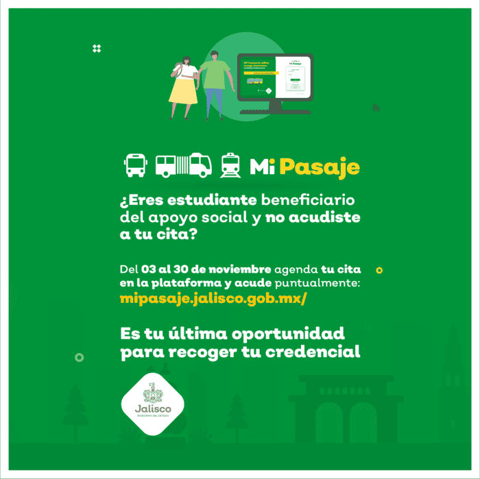 El programa de descuento para transpote denominado en esta administración como "Mi Pasaje", y que anteriormente funcionaba a través de boletos (bienevales o transvales), se encuentra en proceso de migración a la tarjeta personalizada "Mi Movilidad", con la cual se podrán obtener descuentos del 50 por ciento ( Mi Pasaje amarillo) o del 100 por ciento (Mi Pasaje Verde) en la Zona Metropolitana de Guadalajara (ZMG).Los beneficiados pueden ser estudiantes, docentes, personas mayores, discapacitados o niños. La tarjeta es personal e intransferible.Para recibir la tarjeta, las personas dentro de estas categorías tendrán que solicitar una cita para realizar el trámite, ya sea a través de la página oficial del programa o vía telefónica.El plazo para el trámite comenzó desde el pasado 17 de agosto (en el caso de estudiantes y maestros y niños) y vencía este mes de octubre, sin embargo la Secretaría de Transporte (Setran) en coordinación con la Secretaría del Sistema de Asistencia Social (SSAS) anunció una ampliación para el registro y entrega de credenciales.Para estudiantes, maestros y niños las nuevas fechas de credencialización serán del 3 al 30 de noviembre. En esta nueva fase se sumarán tres nuevos módulos de atención que estarán ubicados en las estaciones de la Línea 3 de Mi Tren: Guadalajara Centro, Zapopan Centro y CUCEI.Para realizar el trámite, las personas interesadas deberán registrarse y agendar su cita en el sitio mipasaje.jalisco.gob.mx y elegir la fecha dentro del periodo establecido. Para ello se recomienda tener a la mano la CURP y una identificación oficial con fotografía o acta de nacimiento (la cual se tendrá que escanear y subir a la página web), además te pedirán subir una fotografía.Una vez programada la cita tendrán que acudir a uno de los 32 módulos de atención que se encuentran en la ZMG o a alguno de los nueve que se encuentran en el interior del estado.El trámite para agendar cita es gratuito y sin intermediarios. Para las personas de la tercera edad y con alguna discapacidad, las fechas de atención y entregas de credencia comenzó desde el 16 de octubre y también concluirán el 30 de noviembre.Los documentos (en original y 2 copias) para completar el trámite de credencialización en los módulos son:Se deberá presentar la cita impresa o el número de folio al acudir al módulo de atención.Para asesoría específica, atención personalizada y generación de cita se puede llamar a la línea 33-30-30-12- 25 de lunes a viernes de 8:00 a 20:00 horas y sábados de 08:00 a 13:00 horas.NR