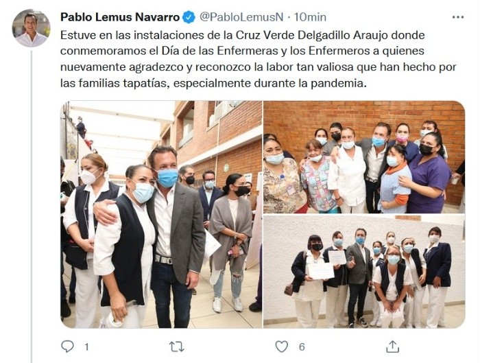 Este 6 de enero se celebra en México el Día Nacional de la Enfermera y Enfermero, por lo que el alcalde de Guadalajara, Pablo Lemus Navarro, reconoció a 13 servidoras de la salud con más de 30 años de servicio en los Servicios Médicos Municipales, esto en un evento realizado en la Cruz Verde Delgadillo Araujo.“Quiero hacer un reconocimiento al trabajo de todas y todos ustedes durante esta pandemia, ha sido verdaderamente complejo. Nosotros estamos convencidos y agradecidos de que el trabajo que ustedes realizan todos los días tiene que verse recompensado”, acotó el presidente municipal.Lemus Navarro, señaló que en los próximos días revisarán las condiciones laborales de los profesionales de la salud del municipio, así como de la infraestructura de las seis unidades Cruz Verde existentes en la capital de Jalisco.Para este 2022, señaló el alcalde que el Gobierno de Guadalajara contará con una bolsa de mil 92.3 millones de pesos (MDP) para infraestructura y obra pública, lo que para él representa un incremento de 225 por ciento en comparación con los recursos invertidos en 2021 que fue 335.8 MDP; esto pretende que se distribuya para la recuperación de espacios públicos como unidades deportivas, escuelas, vialidades y la atención de la salud de los tapatíos.Salvador García Uvence, director general de Servicios Médicos Municipales, destacó la labor imparable de las enfermeras y enfermeros que estuvieron trabajando durante la pandemia de COVID.“Después de 91 años sigue siendo una tradición, una costumbre que este día celebremos hoy a las enfermeras. Tenemos un total de 214 enfermeras y enfermeros dentro de las unidades de Cruz Verde Guadalajara que batallaron seria y duramente en la pandemia”, expresó.Finalizando el evento, se partió la rosca de Reyes, a Pablo Lemus le salió por séptima ocasión consecutiva el Niño Dios, por lo que le tocará invitar los tamales el Día de La Candelaria, el próximo 2 de febrero.JM