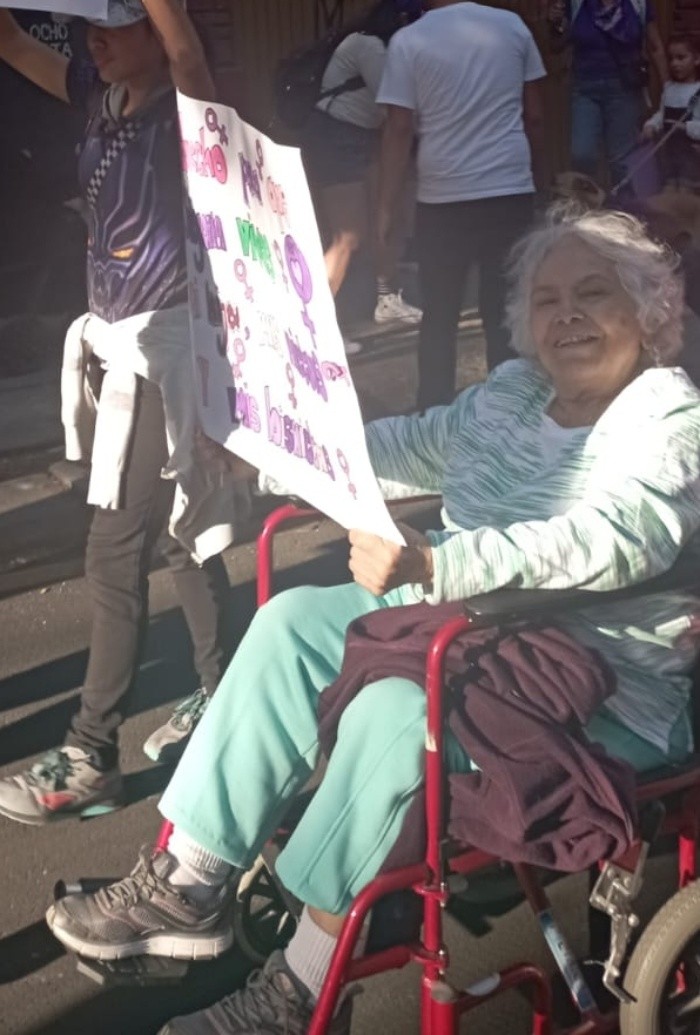La señora Esperanza Barajas, originaria de la Ciudad de México, acudió a la manifestación del Día de la Mujer en Guadalajara para dar ejemplo a sus nietas y bisnietas, quienes la llevaron en silla de ruedas. "También para dar apoyo a las personas que han perdido familiares, necesitan mucha ayuda del Gobierno", dijo, mientras su nieta Elizabeth García la llevaba por Avenida Hidalgo, donde en estos momentos para el contingente liderado por el colectivo Yo Soy 8 de Marzo.El grupo de mujeres de todas las edades partió de la Plaza Imelda Virgen, en Paseo Alcalde frente al Hotel One, rumbo a Avenida Juárez, Federalismo y Avenida Hidalgo, con rumbo a la Glorieta de las y los Desaparecidos.La mayoría de los locales estaban cerrados y en algunos casos los dueños colocaron mantas en apoyo del movimiento. Otras personas permanecieron en sus viviendas y negocios, asomadas desde sus balcones o terrazas.Entre las principales peticiones realizadas está la despenalización del aborto y la aprobación de la ley vicaria, pendientes por analizar en el Congreso de Jalisco.