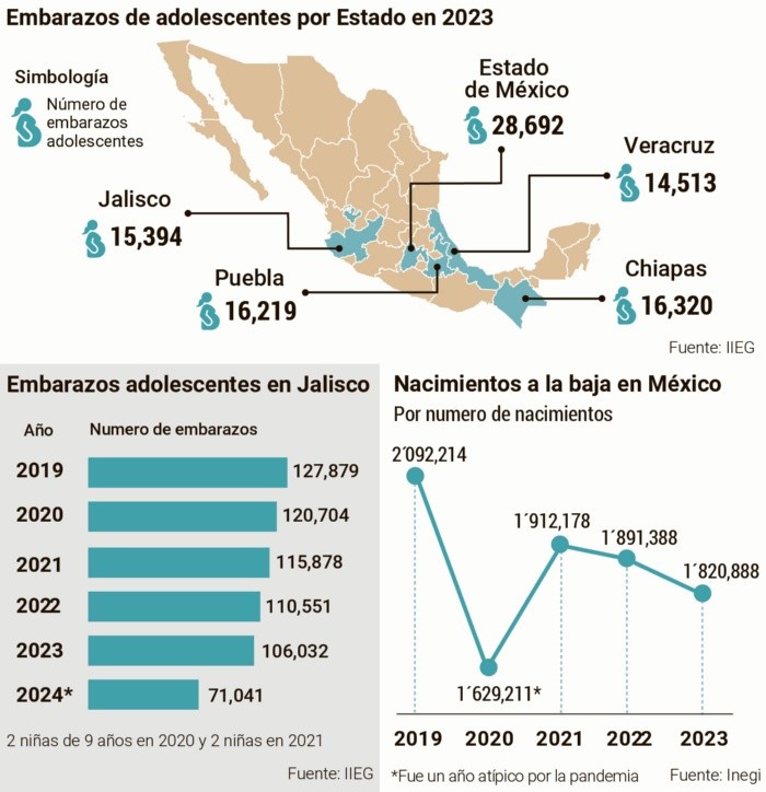 Lorena tiene 17 años y carga entre sus brazos a una bebé de tres meses. Quedó embarazada el año pasado, mientras cursaba el cuarto semestre de preparatoria. No estaba en sus planes tener una hija, ya que le restaban dos semestres y pensaba iniciar trámites para ingresar a la universidad. “Fue un descuido. Ya pedí permiso en la prepa para estar estos meses con mi niña. Pienso regresar en agosto… si se puede”, comenta Lorena, originaria de Tlajomulco, quien forma parte de las más de 15 mil adolescentes que se embarazan cada año en Jalisco. Y los 17 años es una edad clave, según las estadísticas.La buena noticia es que los casos están disminuyendo en el estado: en 2019 se documentaron más de 21 mil. Sin embargo, la Organización Mundial de la Salud advierte que un embarazo adolescente, es decir, entre los 10 y los 19 años, representa un alto riesgo. Los bebés tienen más posibilidades de nacer con bajo peso, de forma prematura o con complicaciones neonatales graves. Alfonso Martín de Alba, profesor de Ginecología y Obstetricia en la UdeG, subraya que la prevención es fundamental para reducir este problema. “Toda la población debe estar informada. La menstruación marca el inicio de la fertilidad, pero no significa que el cuerpo esté listo para procrear”. Estos casos pueden limitar el crecimiento y generar complicaciones graves en las mujeres, como preeclampsia o insuficiencia renal, que incluso pueden derivar en una muerte materna (que es durante el embarazo o dentro de los 42 días siguientes). El Gobierno de Jalisco impulsa campañas de prevención, como la Ruta NAME, que reúne a varias instancias públicas para generar conciencia y atender integralmente los embarazos entre adolescentes. También se ofrecen capacitaciones y servicios de salud reproductiva. Jalisco ocupa el cuarto lugar nacional en incidencia, por debajo del Estado de México, Puebla y Chiapas. A nivel local, Zapopan, Tlajomulco, Guadalajara, Tlaquepaque y Tonalá encabezan la estadística, respectivamente.Eva Elizabeth Camarena, académica de la UdeG, celebra la reducción registrada en los últimos años, pero insiste en reforzar la educación sexual desde la primaria. “La vida sexual comienza a edades más tempranas. En 2023 se registraron 400 embarazos entre menores de 15 años. No deberían existir niñas embarazadas”.Las muertes maternas son otro problema. En 2021 se registraron 61 fallecimientos por esta causa en Jalisco. En 2023, la cifra bajó a 48 en todas las edades, pero sigue siendo preocupante, según expertos.Roberto Carlos Rivera, director de Salud Pública en el Estado, coincide en que la prevención es fundamental. Acentúa que los casos más graves suelen presentarse en mujeres sin acceso a seguridad social y sin control prenatal. “Muchas pacientes llegan con complicaciones severas por falta de atención previa. El control preconcepcional permite detectar deficiencias y prevenir riesgos graves”.Un dato alarmante es que el dengue se ha convertido en una causa de muerte materna en Jalisco. La doctora Eva Elizabeth Camarena agrega que hay pacientes que fallecen por complicaciones derivadas del virus durante el embarazo, lo que resalta la urgencia de reforzar la prevención de enfermedades infecciosas en este grupo vulnerable.