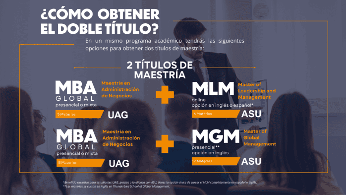 ¿Alguna vez has escuchado sobre la doble titulación en los Posgrados? La doble titulación es una oportunidad para obtener dos títulos de Maestría de forma independiente, cada uno otorgado por instituciones de reconocido prestigio, en un solo programa académico.Esto significa que, al finalizar tus estudios, contarás con credenciales de dos universidades líderes con visión global, lo que consolida tu preparación y visibilidad internacional.La Universidad Autónoma de Guadalajara (UAG) tiene en su oferta académica el MBA Global, un programa innovador impartido en alianza con la prestigiosa Thunderbird School of Global Management de Arizona State University (ASU), reconocida como la escuela #1 en el mundo en Negocios Internacionales. Este esquema permite a los estudiantes combinar la excelencia académica de la UAG, respaldada por 90 años de historia, con el prestigio global de ASU.Este programa es único en su tipo y la UAG te acompañará en cada paso. El camino para obtener la doble titulación inicia al estudiar 5 materias del MBA Global de la UAG, de manera presencial o mixta, con clases en español.Al concluir esas 5 materias continuarás tu ruta académica cursando las asignaturas en ASU de acuerdo a la opción que decidas tomar: Master of Leadership and Management (MLM) o el Master of Global Management (MGM).El MLM se cursa en línea y puede tomarse en inglés o español. Este programa es excelente para quienes quieren cursar una Maestría innovadora con visión global sin salir de México.El MGM, por su parte, es presencial en ASU y con materias en inglés, lo que brinda una inmersión completa en el campus de la prestigiosa institución de Estados Unidos.Dicho esquema te permitirá tener la doble titulación en corto tiempo, ya que el programa está planteado para que en tan solo 2 años, como estudiante de tiempo completo, obtengas ambos títulos. Además, representa un ahorro importante, ya que en el caso del MGM el costo final representa una reducción del 30%, en comparación de tomar las dos Maestrías por separado, y del 60% en el MLM.Con el MLM, desarrollarás habilidades de liderazgo y gestión para roles internacionales, además tendrás acceso a experiencias prácticas globales. El MGM, por su parte, te permitirá especializarte en una de más de 16 áreas innovadoras, lo que impulsará tu éxito.Esta modalidad de doble titulación va más allá de obtener dos títulos en corto tiempo, también es una inversión estratégica para tu futuro profesional. Algunas ventajas son:Reconocimiento y validez dual: Obtendrá un título de la UAG válido en México y otro de ASU con validez en Estados Unidos.Modalidad flexible: Estudia sin interrumpir tu ritmo de vida profesional.Conecta con el Mundo: Participa en seminarios globales y laboratorios prácticos internacionales para liderar a nivel global.Posibilidad de trabar en Estados Unidos: En caso de seleccionar el doble grado con el MGM podrás aplicar al programa STEM-OPT que te permite trabajar hasta por tres años en Estados Unidos una vez concluido tu programa de Maestría.¡No pierdas tiempo!¿Estás listo para dar el siguiente paso? Se te interesó esta información, conoce más detalles de este programa transformador e ¡Iniciar tu camino hacia el liderazgo con el MBA Global UAG-ASU!