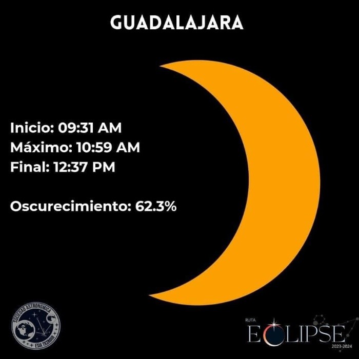 México tendrá un eclipse solar parcial el próximo 14 de octubre del 2023. Esto significa que la luna no cubrirá al sol en su totalidad, lo que ocasionará el particular fenómeno conocido como "aro de fuego", como si una sonrisa solar iluminara el cielo confundido por las penumbras parciales.El eclipse solar comenzará en Estados Unidos, y pasará por Oregón, Nevada, Utah, Nuevo México, Texas, y su sombra titánica se internará por el Golfo de México. Su negrura silenciosa entonces pasará como una mariposa de la noche en Honduras, Nicaragua, Panamá, Colombia, y se desvanecerá, finalmente, en el Atlántico brasileño. Debido a que la trayectoria del eclipse atravesará el Atlántico, y su sombra sólo recorrerá la Península de Yucatán, no será posible contemplar el fenómeno en su totalidad desde nuestro estado. De acuerdo con este mapa interactivo que rastrea la sombra del eclipse, la visibilidad en Guadalajara será tan solo del 62.68%, al contrario de Campeche, donde la oscuridad será del 90%. Este será el horario del eclipse en Guadalajara:De acuerdo con la página de especialistas Ruta Eclipse, este es el aspecto que el eclipse solar del sábado 14 de octubre tendrá sobre Guadalajara. Si decides disfrutar del eclipse, no olvides observarlo a través de filtros especializados, pues recuerda que mirarlo directamente puede dañar tu mirada. FS