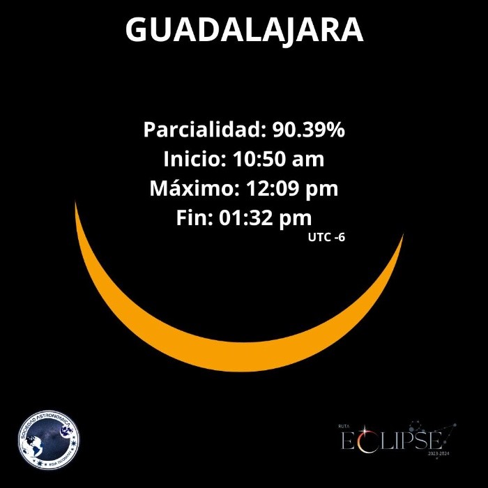 El eclipse solar del próximo 8 de abril del 2024 oscurecerá gran parte del norte de México, y cuando se refiere a que será "total", es debido a que se hará de noche a mitad del día, algo que no acontecía en nuestro país desde el 11 de julio de 1991. El mejor lugar para contemplar el "gran eclipse mexicano" -como ya se conoce a este evento- será en Mazatlán, Sinaloa, donde la noche caerá de pronto sobre el mediodía del mar. El eclipse solar del lunes 8 de abril también será visible en Guadalajara, aunque no del mismo modo en el que podrá apreciarse en Mazatlán. En nuestra ciudad, de acuerdo con la Universidad de Guadalajara, el porcentaje de oscuridad será del 90.6%, lo que indica que, si bien la penumbra no será total, sí podemos esperar un cambio significativo en la luz del día.Este es el aspecto que tendrá el eclipse en nuestra ciudad el próximo lunes 8 de abril: FS