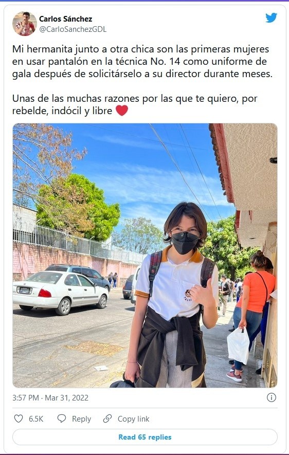 Subir las escaleras y poder sentarse de la manera que quiere son dos ventajas que Karol Sánchez, de 13 años, tiene al usar pantalón en lugar de falda para ir a la escuela con uniforme de gala.Desde que inició el segundo año en la Secundaria 14 y tuvo que ir de manera presencial tras la pandemia de COVID-19, quiso usar pantalón en lugar de falta, pero cuando llegaron los uniformes del Gobierno de Jalisco y de las mismas personas que venden en el plantel no había opción: se tenía que usar la falda.Ahí comenzó su lucha.Hace dos semanas preguntó a su orientador si se podía usar pantalón y dijo que sí, “pero que tenía que poner en la agenda, padres o tutores, un recado dijera el porqué y los directivos verían si lo aceptaban”.Algunas de las justificaciones para hacerlo es que la alumna usa transporte público o se identifica como hombre. A Karol su mamá escribió que era por el acoso callejero y el uso de camión a diario. Y lo logró. Desde entonces usa pantalón, aunque es el del uniforme de varón, y está más cómoda fuera y dentro del plantel.“En la primaria no me fijaba tanto en eso porque era más chiquita, pero normalmente siempre me llevaba pants porque siempre he sido de querer moverme mucho y a veces el jumper me lo impedía. Es muy cómodo traer pantalón porque yo no me puedo sentar bien por mucho tiempo, tengo que estarme moviendo para no distraerme o aburrirme y ya puedo hasta sentarme mejor, es más fácil pasar entre las filas para llegar a mi lugar y saber que el recreo nadie te va a ver los calzones o el short que traigas debajo”, compartió.Aunque Karol logró ganar una pequeña lucha, compartió que no se debería justificar el uso del pantalón, sólo elegir.“Me han preguntado sobre cómo hacer el trámite y es fácil pero a la vez difícil porque no sabes si te lo van a aprobar o no. Muchas de mis compañeras dicen que sus sus papás no las dejarían y a quienes sí tendrían que inventar un pretexto porque, si no, no las dejarían en la escuela”, dijo.Pero también, recordó que el usar lo que deseen es parte de la libertad de expresión en la que se deberían basar para poner reglamentos.“Los papás no tendrían que hacer un recado con excusas para que lleven pantalón, es innecesario y es más fácil que nos den los uniformes ya con pantalón o que podamos elegir”, expresó.En Twitter, los usuarios aplaudieron la iniciativa de Karol e, incluso, exalumnas recordaron que cuando ellas estudiaban no podían ni pensar en ello.“Yo estuve en esa escuela, la técnica 14, hace muuuchos años. Ni imaginar que sucediera algo como lo que logró tu hermana. Enhorabuena”, escribió el usuario @jgnaredo en respuesta a la foto publicada por el hermano de Carlos.“Yo estuve en esa secundaria, era un sueño lejano que eso se pudiera, me representa”, expresó @PerdiaBelen.Mientras que algunos más recordaron el acoso al que se exponían por usar falda.“Wow! Nunca me gustó llevar falda. En la primaria un niño me tocó las piernas, subir escaleras cubriéndote de todos lados para que no se vea nada, etc… qué bueno que lo lograron. Ojalá pronto sea opcional la falda. Me hubiera encantado poder elegir”, redactó la usuaria @Lra_gzz.JM