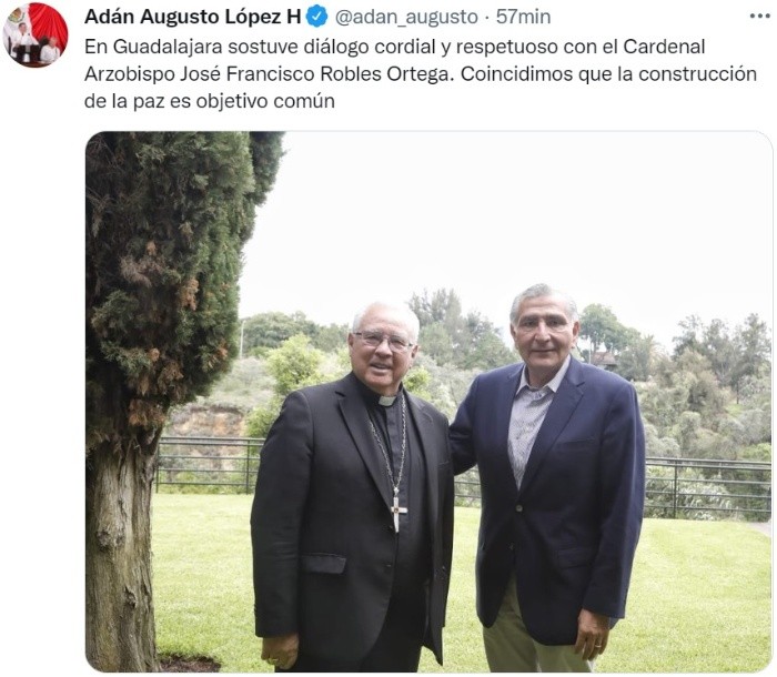 El titular de la Secretaría de Gobernación (Segob), Adán Augusto López Hernández, visita este sábado Guadalajara, donde impartirá la conferencia “La importancia de Jalisco y su relación con el Gobierno de México”.Previo a sus actividades, el funcionario federal se reunió con el cardenal José Francisco Robles Ortega, quien hace unas semanas denunció la presencia de retenes de la delincuencia organizada en carreteras de la zona norte de Jalisco.“En Guadalajara sostuve diálogo cordial y respetuoso con el Cardenal Arzobispo José Francisco Robles Ortega. Coincidimos que la construcción de la paz es objetivo común”, escribió en Twitter el funcionario federal junto con una fotografía con el titular de la Arquidiócesis tapatía.En la Expo cientos de simpatizantes asisten al evento, decenas de camiones arriban con personas que acuden de diferentes colonias de la Zona Metropolitana de Guadalajara.Está programado que López Hernández de una rueda de prensa y sostenga reuniones privadas antes de volver a la Ciudad de México.OA