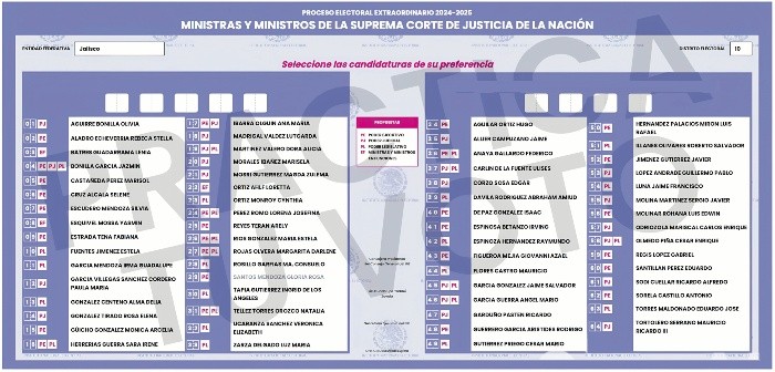 Este domingo se realizará una elección inédita en México para renovar el Poder Judicial de la Federación. Y en Jalisco están en juego cargos en la Suprema Corte de Justicia de la Nación, en el Tribunal Electoral, en el nuevo Tribunal de Disciplina Judicial, en los Tribunales Colegiados y los Juzgados de Distrito.El delegado del Instituto Nacional Electoral (INE), Luis Zamora Cobián, apuntó que los jaliscienses elegirán cargos para quienes laboran en el estado y desde la Ciudad de México. Cada persona que acuda a las urnas recibirá seis boletas. En general, en Jalisco se elegirán 74 cargos para ministros, magistrados y jueces federales.“Estamos en la oportunidad de definir el sentido de nuestro voto para elegir a personas con un perfil académico adecuado, con un ejercicio profesional suficiente, que lo podemos conocer ahí en el micrositio de ‘Conóceles’, para que podamos elegir a los profesionales del derecho que impartirán justicia desde el Poder Judicial de la Federación”, acentuó Zamora Cobián, quien invitó a la ciudadanía a que ejerza su derecho a la democracia.El INE dispondrá de cuatro mil 999 casillas. De acuerdo con el consejero electoral, Antonio Corona Nakamura, existirá por lo menos una casilla en cada sección, a fin de que todos los jaliscienses con una credencial para votar vigente puedan emitir su sufragio. Zamora Cobián explicó el proceso que debe seguir cada elector: llegará a su casilla, mostrará su INE, recibirá seis boletas diferentes, tras verificar que se encuentra en el listado nominal y se le marcará el pulgar. De ahí se dirigirá a las mamparas para llenar las boletas. Luego las depositará en las urnas correspondientes y no deberá regresar con los funcionarios de casilla.De acuerdo con las autoridades, sí pueden llevar anotaciones sobre los candidatos que elegirán, pero alertan que otras personas no pueden repartir los llamados “acordeones” porque es un delito y se sancionará (el árbitro electoral prohibió a servidores públicos, partidos políticos, simpatizantes y a cualquier persona la elaboración y la distribución de estos documentos para inducir el voto en favor de algunos candidatos).Tras varios ejercicios de práctica, se estima que las personas no demoren más de seis minutos dentro de la casilla. Sin embargo, el delegado hizo un llamado a la ciudadanía a que comience a ser parte de este proceso electoral conociendo a los candidatos según su distrito y su sección, en la plataforma https://candidaturaspoderjudicial.ine.mx, donde se dan a conocer los nombres de los aspirantes, la materia en la que pretenden desempeñarse, el distrito al que responderán, el número en la boleta y quién lo postuló (entre los Poderes Judicial, Ejecutivo o Legislativo). Desde el 30 de marzo a la fecha suman más de 14.4 millones visitas en el portal para conocer cómo se vota y los perfiles.La presidenta del INE, Guadalupe Taddei, y la titular del Tribunal Electoral, Mónica Soto, invitan a votar, pero antes deben analizar los perfiles de los aspirantes, sobre todo por los llamados a no acudir a las urnas y la distribución masiva de “acordeones”.Por otra parte, el Gobierno de Jalisco se declaró listo para garantizar la seguridad en los comicios. Según el INE, solamente seis casillas no serán instaladas en el sur del estado: Jilotlán de los Dolores, Pihuamo y Santa María del Oro.Se destaca que la elección es para cargos federales. Para elegir jueces y magistrados locales se prevé que los comicios sean hasta 2027.1. Por ejemplo, la boleta de color morado será para elegir a los integrantes de la Suprema Corte de Justicia de la Nación. 2.Deben identificar los nombres de los aspirantes.3.Cada persona elegirá a cinco ministras y cuatro ministros.4. Luego escribirá los números de cada aspirante elegido en los espacios en blanco.