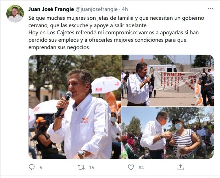 Durante su visita en la colonia Los Cajetes, el candidato de Movimiento Ciudadano (MC) a la presidencia municipal de Zapopan, Juan José Frangie, prometió que dará seguro de desempleo de dos y hasta tres meses a las mujeres que hayan perdido su trabajo a causa de la pandemia o por otros motivos."Vamos a sacar un programa a partir del mes de octubre, que es un programa que la que no tenga trabajo y lo haya perdido les vamos a dar un bono durante dos meses y las vamos a ayudar a encontrar trabajo, este bono va a ser de cinco mil pesos mensuales a cada una durante dos meses".Si no logran conseguir trabajo en ese lapso, podrá extender el apoyo un mes más.Frangie reconoció la importancia de las mujeres en la sociedad, quienes le han manifestado sus necesidades durante los recorridos que ha hecho en el municipio, entre ellas, la pérdida de trabajo o el cierre de sus negocios.Frangie también identificó que en las colonias Los Cajetes, Agua Blanca y La Florida faltan calles pavimentadas, por lo que esto estará contemplado en su proyecto con una inversión en el primer año de 500 millones de pesos, si consigue ganar las elecciones."Todo Zapopan sin tierra y sin lodo, todas las calles de tierra que existan en el municipio que estén regularizadas, que estén deterioradas se van a arreglar con pavimento para que las niñas y los niños puedan jugar durante ese tiempo", declaró.JM