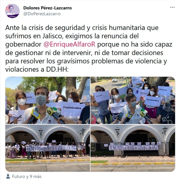 La candidata a la presidencia municipal de Guadalajara por Futuro, Dolores Pérez-Lazcarro, exigió la renuncia del gobernador de Jalisco debido a que, asegura, no ha sido capaz de gestionar y resolver los problemas de inseguridad, desapariciones forzadas, incendios forestales y escasez de agua que aquejan a toda la entidad.Durante una manifestación este jueves frente a Casa Jalisco, Pérez-Lazcarro aseguró que, más allá de las campañas políticas y en su calidad de activista a favor de los derechos humanos, es necesario alzar la voz ante la gravedad de los acontecimientos.“Con o sin campaña estaríamos aquí frente a Casa Jalisco, pidiendo la renuncia del gobernador quien dice que no le toca la crisis de seguridad, ni la crisis del bosque, ni la crisis del agua”, declaró la aspirante de Futuro.Sobre las desapariciones de jóvenes, Dolores Pérez-Lazcarro indicó que tan sólo entre el 7 y 10 de mayo del presente año fueron sustraídos y asesinados los tres hermanos estudiantes: Ana Karen, Luis Ángel y José Alberto González Moreno. El fin de semana siguiente se notificó la desaparición de cuatro adolescentes que aparentemente estaban juntas y una más en el municipio de Tlajomulco.Pérez-Lazcarro consideró insostenible la situación de violencia, inseguridad y desapariciones en Jalisco, sobre todo de mujeres jóvenes, pero también el hecho de que a los feminicidios se sumen los crímenes de odio contra la comunidad LGBTTTIQ+, las desapariciones de hombres jóvenes de entre 15 y 30 años y de mujeres de entre 13 y 18 años y la exhumación de cuerpos de fosas clandestinas, así como las operaciones del crimen organizado.“A las cosas tenemos que llamarlas por su nombre, nos están desplazando, nos están matando y nos están desapareciendo. Sí soy Dolores Pérez-Lazcarro y estoy buscando el voto, pero independientemente de eso, señoras y señores, convoco a la sociedad civil a que paremos todo”, indicó la candidata.Anunció que se presentará una queja ante la Comisión Interamericana de Derechos Humanos (CIDH) con la finalidad de que realice lo antes posible una visita a Jalisco y se dé cuenta de la crisis humanitaria y de seguridad que se vive en esta zona.Además del pronunciamiento, la candidata junto con los integrantes de su planilla y las candidatas a los distritos 9 y 14, Elanie Torres y Mariana Casillas, colocaron pancartas frente a Casa Jalisco con la descripción de los hechos y los crímenes que no han sido resueltos en el estado; asimismo, dejaron en las vallas que impiden el ingreso a Casa Jalisco, una pancarta con la leyenda: “Tenemos derecho a vivir en paz”.JM