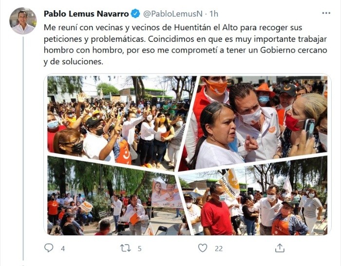 Pablo Lemus, candidato de Movimiento Ciudadano a la presidencia municipal de Guadalajara, prometió en Huentitán El Alto, que, de ganar los comicios del 6 de junio, estará en las calles: “no seré un presidente municipal encerrado en su oficina”.Además, el candidato emecista se reunió con vecinos del distrito 11, en la Expenal de Oblatos, a quienes señaló que la apuesta es desarrollar una política pública de prevención del delito que coloque al ser humano en el centro de las decisiones, con acciones enfocadas a la educación, la cultura y el deporte.A esto, dijo, se suma el fortalecimiento de la Policía Municipal y la reactivación de la economía tapatía, afectada tras la pandemia de COVID-19.Los vecinos solicitaron mayor vigilancia en la zona, mejoramiento en servicios públicos como alumbrado y atención al arbolado, así como la implementación de planes de ejercicio y actividad física para las personas mayores, mientras que en Brisas del Nilo los vecinos solicitaron la habilitación de mayor número de espacios públicos en esta zona.JM