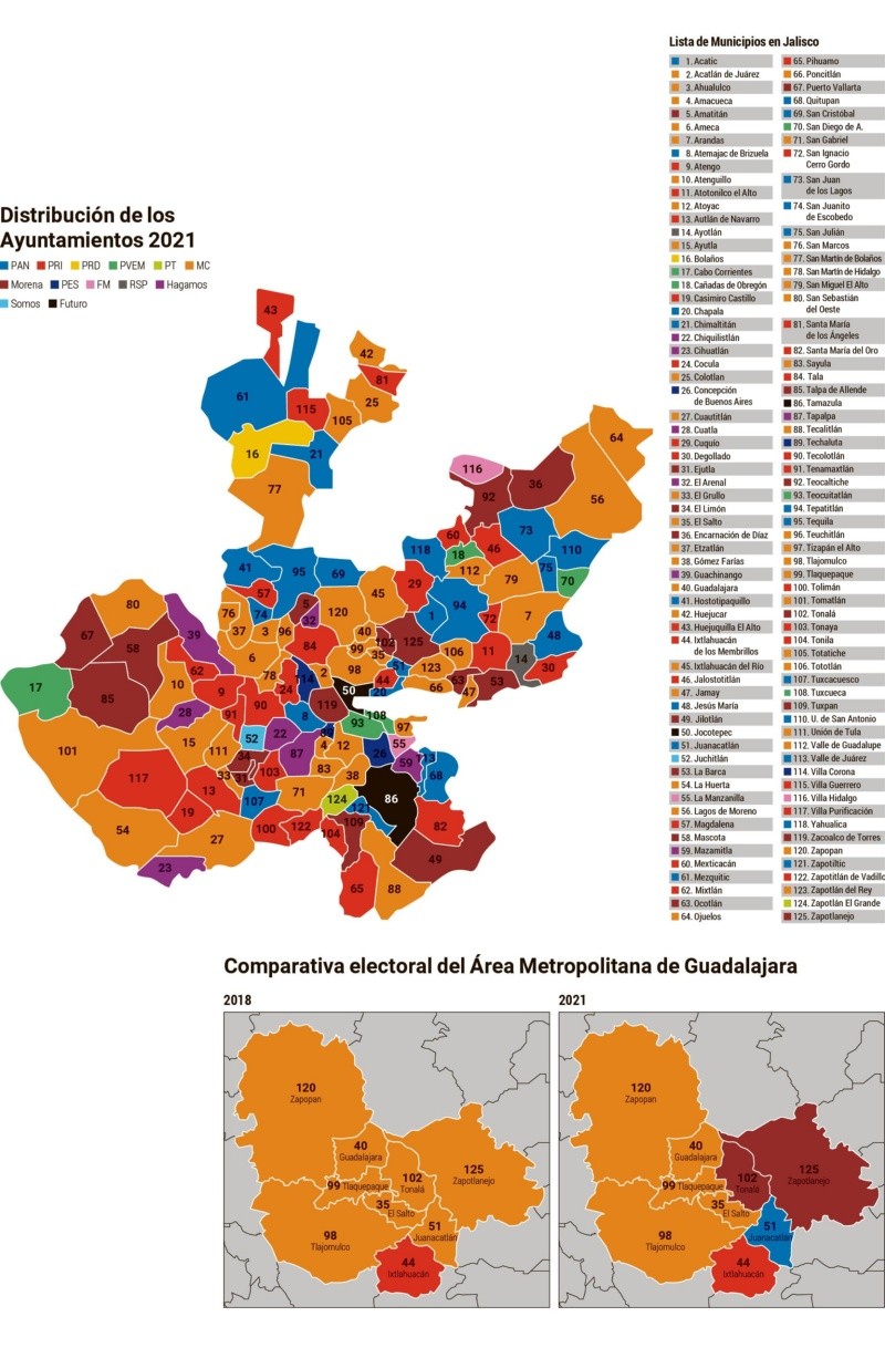 El Partido Movimiento Ciudadano aventaja en 41 municipios de Jalisco, con un avance de 46.5% en el Programa de Resultados Electorales Preliminares (PREP). De no existir cambios, triunfaría en los más poblados como Guadalajara, Zapopan, Tlajomulco, Tlaquepaque y El Salto.“A partir de mañana (hoy) me tengo que poner a trabajar mucho. No hay tanto tiempo. Quiero ir a festejar también con mi familia...”, dijo emocionado Pablo Lemus, quien lleva la delantera en Guadalajara. Aunque festejaría también con Juan José Frangie (quien lidera en Zapopan) y otros emecistas, la lluvia de anoche suspendió la celebración en La Minerva.Al cierre de edición (01:39 horas), el PRI se perfilaba como ganador en 26 municipios y el PAN en 20. Morena adelanta en 15, principalmente Tonalá y Zapotlanejo.La jornada inició con el retraso en la instalación de casillas, lo que generó molestias. Por la noche, el gobernador de Jalisco celebró una jornada ejemplar y manifestó que se respetarán los resultados de las elecciones. Sin embargo, a las 01:00 horas de este lunes sesionó el pleno del Instituto Electoral y de Participación Ciudadana para dar a conocer el robo de urnas por parte de grupos delincuenciales en Villa Purificación, La Huerta, Cihuatlán, Casimiro Castillo y Unión de Tula. “El caso más grave fue en La Huerta, porque se quedaron sin consejo municipal”, lamentó el presidente Guillermo Alcaraz. Tras la jornada de ayer, hasta el momento se rompió la tendencia de las últimas elecciones intermedias donde perdía el control el partido en el Gobierno del Estado, principalmente en el Área Metropolitana de Guadalajara.Lo que no pudieron sostener mandatarios como Emilio González Márquez (del Partido Acción Nacional) y Aristóteles Sandoval (del Partido Revolucionario Institucional) en los comicios intermedios de los años de 2009 y 2015, respectivamente, en esta ocasión Movimiento Ciudadano (MC) rompió la “maldición” y, según el avance del Programa de Resultados Electorales Preliminares (PREP) al 46.5%, todo apunta que mantendría la hegemonía en la metrópoli, incluso con mayoría en el Congreso del Estado.Según los resultados oficiales, Tlajomulco se convertiría en el municipio con más triunfos consecutivos por parte de Movimiento Ciudadano: las últimas cinco elecciones. Persiste como el bastión emecista desde el año 2010.De confirmarse los resultados por la autoridad electoral, en Guadalajara y Zapopan sumarán tres victorias seguidas. Y el personaje principal es Pablo Lemus, quien le dio el triunfo al partido en Zapopan en 2015 y 2018 (con reelección en este último), pero ahora abonaría y será el vencedor en los comicios de Guadalajara, superando al candidato morenista, Carlos Lomelí.De acuerdo con la elección de 2018, de los nueve Ayuntamientos del Área Metropolitana de Guadalajara, MC ganó ocho Ayuntamientos. Aunque en los comicios de ayer se perfila hasta el cierre de edición para ganar cinco, gobernaría a más de 4.5 millones de habitantes de los 5.2 millones de pobladores en toda la metrópoli, principalmente porque encabezaría los tres municipios más poblados de Jalisco: Zapopan, Guadalajara y Tlajomulco, respectivamente, algo que el partido en el Gobierno estatal no había conseguido en las últimas dos elecciones intermedias. También le alcanzaría para triunfar en Tlaquepaque y El Salto, aunque se debe esperar a los resultados finales.En el último corte de las 01:39 horas de este lunes, Movimiento Ciudadano aventajaba en 41 de los 125 municipios de Jalisco.Aunque la elección transcurrió con calma en la mayoría de los municipios de Jalisco, Guillermo Alcaraz, presidente del Instituto Electoral y de Participación Ciudadana, lamentó el robo de urnas por parte de sujetos armados.La problemática fue en la Región Costa Sur, en cinco municipios: Villa Purificación, La Huerta, Cihuatlán, Casimiro Castillo y Unión de Tula. “Hay paquetes robados de las casillas. El caso más grave fue en La Huerta, porque se quedaron sin consejo municipal. Se está dando un receso por tiempo indeterminado, no queremos una tragedia. Es lamentable que esto esté pasando, era una jornada pacífica, con participación copiosa, pero es lamentable y se tomó esa determinación”.Hoy se reanudará la sesión a las 13:00 horas del Instituto para continuar analizando este caso. Mónica Montaño, académica de la UdeG.El hecho de que los resultados del Programa de Resultados Electorales Preliminares (PREP) adelanten el triunfo a Morena en municipios como Tonalá, por ejemplo, en lugar de dárselo de manera directa a Movimiento Ciudadano, representa que la ciudadanía ha decidido dar pluralidad a la elección y no quedarse totalmente con el partido que actualmente gobierna, explicó la doctora Mónica Montaño, académica de la Universidad de Guadalajara.“Se esperaba que fueran más contundentes las derrotas o las victorias tanto de Movimiento Ciudadano como de Morena, pero se observa un escenario de pluralidad, donde los ciudadanos han buscado equilibrios. Se ha mostrado el voto estratégico, hemos estado viendo en algunas actas donde hay voto cruzado o dividido. Hay votos diferenciados por diputados y por munícipes. Y eso es muy bueno, porque quiere decir que en estas elecciones intermedias los ciudadanos supieron que tienen el poder del voto y lo usaron para enviar un mensaje tanto al Gobierno local como al federal”.Lo anterior se ve reflejado también en que, pese a la existencia de nuevos partidos, el PAN y el PRI recibieron una cantidad de votos considerables respecto a las agrupaciones de reciente formación, lo cual quiere decir que su estrategia del llamado al voto útil funcionó, haciendo que partidos como Futuro y Hagamos recibieran los votos suficientes para mantener su registro.“Sí esperábamos que cambiara el escenario de los partidos a nivel local, pero al parecer no será así, siguen quedando los partidos tradicionales. Tuvimos partidos 