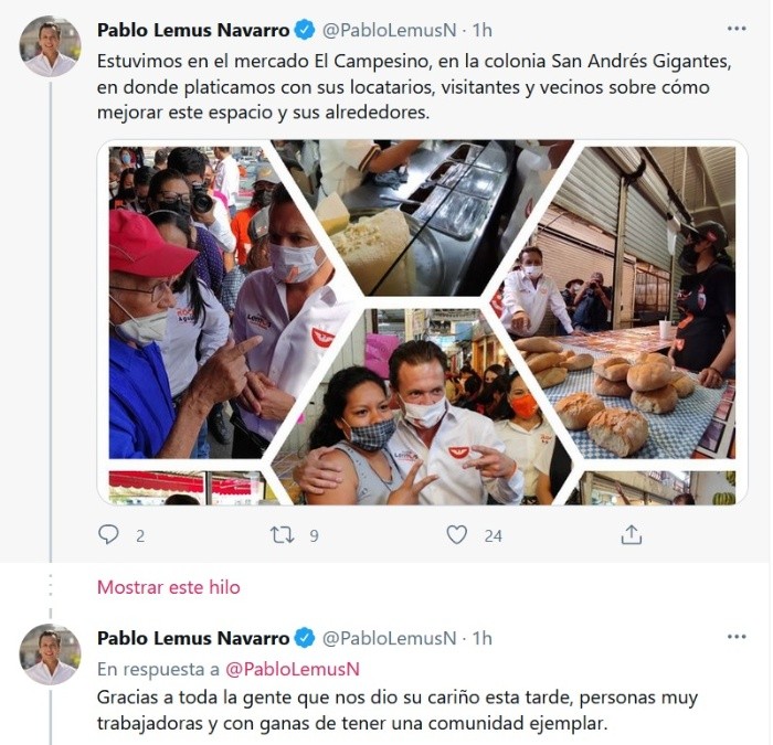 Al estar en penumbras por las noches y haber poca vigilancia, además de que las condiciones sanitarias no son óptimas, los locatarios del Mercado del Campesino, ubicado en Gigantes y María Benítez, demandaron mejora en las condiciones al candidato a la presidencia de Guadalajara por Movimiento Ciudadano, Pablo Lemus.“Estamos estableciendo estos compromisos porque nosotros que la recuperación económica de Guadalajara nace de los pequeños comercios, de los negocios familiares”.Lemus acudió acompañado de Rocío Aguilar y Edith Mujica, candidatas a la diputación por el Distrito 11 local y federal, respectivamente.Pablo Lemus divulgó entre los locatarios algunas de sus propuestas para la reactivación económica de Guadalajara. Reiteró que, de ganar la Presidencia, condonará pagos municipales en tianguis, mercados y negocios con giros A.Además, implementará un programa de créditos por hasta 50 mil pesos, con tasa cero de interés y seis meses de gracia para pagar en 18 meses, a fin de que los comerciantes cuenten con capital de trabajo.El candidato recabó algunas solicitudes de los locatarios y visitantes, como mejoramiento del aseo y alumbrado público y mayor seguridad en la zona, demandas que se comprometió a solventar.JM
