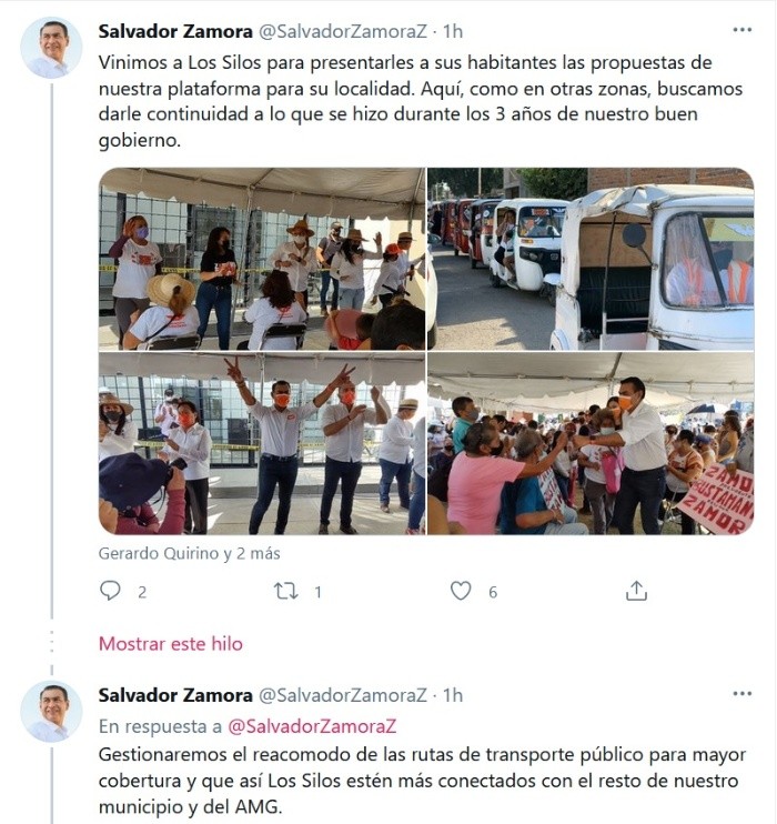 Más y mejor transporte público para Silos y Rancho Alegre fue la propuesta de Salvador Zamora Zamora, candidato de Movimiento Ciudadano (MC) a la presidencia municipal de Tlajomulco de Zúñiga.El aspirante visitó la tarde de este jueves ambos fraccionamientos, y allí se comprometió a gestionar mejoras en los sistemas de transporte para lograr una mayor cobertura.“Por supuesto que estamos trabajando en el sistema de transporte público masivo, y aquí quiero hacer un reconocimiento a los mototaxis, hoy es nuestra única alternativa para movernos a la ruta troncal que tenemos, que se implantó apenas en este gobierno y que nos lleva hasta el Mercado de Abastos, al menos nos acerca a la Ciudad, y con esta ruta ya tenemos una alternativa”, señaló Salvador Zamora.“Estamos en el proceso para regularizar el sistema de mototaxis, todo el sistema de servicio condominal, como le llamamos, para poder regularlo, que ya tengan una tarifa, que ya tengan un permiso, que tengan seguridad social y que puedan hacer el trabajo de llegar a las rutas troncales”.El candidato de MC recordó que durante la presente administración el municipio cedió sus recursos del Fondo Metropolitano (FONMETRO) para la construcción de Mi Macro Periférico, y que empujará otro proyecto de sistema de autobús de tránsito rápido (BRT) sobre la carretera a Chapala.“La siguiente etapa es construir un sistema de transporte como el Macrobús, articulado, que vendrá en su primera etapa hasta el Aeropuerto y en su segunda etapa irá hasta Chapala, lo que va a beneficiar por supuesto a la gente de esta zona, es muy importante esta obra”, afirmó.Entre otras propuestas para la zona, Zamora destacó continuar con el rescate de viviendas deshabitadas, reencarpetar el ingreso a Rancho Alegre y cambiar el alumbrado público por tecnología LED.“A pesar de las dificultades, de la lejanía, esta gente ha estado con nosotros, con su gobierno, pero también asumir un compromiso, que entre ciudadanos y gobierno vamos a salir adelante”, concluyó el candidato.JM