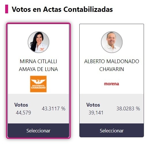 Hasta las 11:15 horas de este lunes y con el 100% de las actas computadas, Citlalli Amaya, candidata a la alcaldía de San Pedro Tlaquepaque, aventaja la elección extraordinaria con el 43.3117%, es decir, 44 mil 579 votos.Con una participación ciudadana del 21.6088%, Citlalli Amaya se encuentra a la cabeza del Programa de Resultados Electorales Preliminares (PREP) en la elección extraordinaria del Ayuntamiento de San Pedro Tlaquepaque 2021, frente a su más próximo contendiente, Alberto Maldonado, del Movimiento de Regeneración Nacional (Morena), con 38.028 %, lo que significa 39 mil 141 votos; una diferencia de 5 mil 438 votos a favor de la abanderada de Movimiento Ciudadano.Mientras que en el tercer lugar quedó la candidata del PAN, María del Rosario Velázquez con siete mil 430 votos.Ayer, Amaya dijo que se ratificó “como la próxima presidenta municipal de San Pedro Tlaquepaque. Ganó la justicia en San Pedro Tlaquepaque, ganó Movimiento Ciudadano”.Mientras que Maldonado también refirió que “ganamos de muchas maneras. Ganamos con la razón jurídica, la contienda jurídica por sacarnos de la boleta y les ganamos hoy (ayer)”.La elección se celebró con apenas 21% de participación ciudadana. Es decir, solo dos de cada 100 personas que podían votar lo hicieron.Los resultados oficiales los dará a conocer el Instituto Electoral y de Participación Ciudadana de Jalsico (IEPC) el viernes.OA