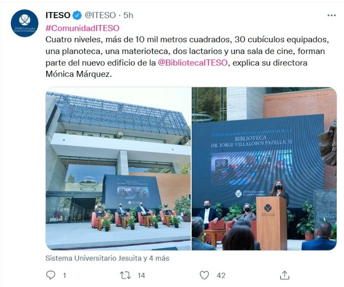 Con la finalidad de impulsar el aprendizaje, la creatividad, investigación y la cultura de la información en su comunidad educativa, a través del acceso de recursos formativos y culturales, este martes fue inaugurado el nuevo edificio de la Biblioteca Dr. Jorge Villalobos Padilla del Instituto Tecnológico y de Estudios Superiores de Occidente (ITESO), con la presencia de autoridades y colaboradores de esta casa de estudios y autoridades estatales, así como del escritor y periodista mexicano Juan Villoro.El espacio, de casi 12 mil metros cuadrados de construcción en cuatro niveles, cuyo mobiliario, equipamiento y tecnología han sido renovados por sistemas de última generación, cuenta 30 cubículos equipados, 2.5 kilómetros de acervo en su respectiva estantería, áreas de exposición, colaboración, áreas con temperatura e iluminación especial para los libros “antiguos y raros”, una planoteca y una materioteca. También, dijo, alberga una sala de lectura “por placer”, cabinas de sueño, una sala “para experimentar”, dos lactarios, auditorios, una cafetería, una sala de cine, un aula equipada para proyectos de información, una sala para las y los trabajadores de la casa de estudios y un ágora en el corazón del edificio.“¿Quieres estar concentrado en absoluto silencio? hay un espacio para ti, ¿quieres trabajar en colaboración, reunirte con tu grupo? ¿quieres investigar, pensar, aprender, desaprender, discutir, imaginar? hay un lugar para ti. Queremos que la biblioteca sea un espacio de hospitalidad radical como decía Daniel Goldin: un refugio, un lugar de encuentro, igualación de oportunidades en donde se proponen herramientas de pensamiento, se estimula la curiosidad y el debate”, expresó la directora de la biblioteca, Mónica Márquez Hermosillo.Este proyecto colectivo, añadió, no hubiera sido posible sin el apoyo de la junta de gobierno, sin el respaldo de los rectores, de los donadores, del equipo de construcciones y del despacho encargado de la construcción, Mantis Arquitectos, así como de cada uno de los departamentos que formaron parte del mismo.“Esta obra, comenzada con un simple estante de libros, es ahora el lugar que además de contar con una construcción imponente, intenta ser un espacio de encuentro de la comunidad en la que sus salas, cubículos, laboratorios, salones abiertos, e incluso lugares para dormir, sea la casa de todos, como dice el lema que hemos usado para referirnos a este edificio”, dijo por su parte, la directora General Académica, Catalina Morfín.Por último, el rector del ITESO, Luis Arriaga Valenzuela, indicó que este espacio se conforma como un ente que responde a los ideales y el modelo educativo de la casa de estudios y de la Compañía de Jesús, pues es este nuevo edificio un espacio que buscará favorecer la interacción como parte del proceso formativo jesuita, además de aportar al conocimiento bien documentado, a su resguardo y su aprovechamiento, como el centro de dicho proceso.“Las bibliotecas son justamente uno de los más ricos yacimientos del saber humano, de un saber que encuentra pleno sentido al convertirse en acción transformadora del mundo, y creo que esto tiene mucho que ver son lo que queremos ahora: ser y formar personas libres para transformar”, añadió.La biblioteca del ITESO se inauguró formalmente en 1975 con el nombre que honra la memoria del doctor Jorge Villalobos Padilla, fundador de la universidad y su primer rector jesuita. Desde entonces, la casa de estudios se encarga de enriquecer su acervo, a la par de las donaciones hechas por jesuitas, exalumnos, profesores, entre otras personas, para conformar, en colectivo lo que es ahora la más importante biblioteca privada del occidente de México, que cuenta además con 18 fondos especiales, explicó el rector del ITESO, Luis Arriaga Valenzuela.JM