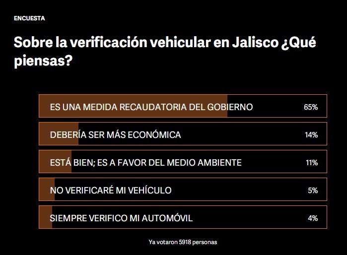 El Gobierno de Jalisco informó que a partir del 1 de agosto volverá el programa de verificación vehicular para autos particulares, y para el 65% de los participantes en una encuesta elaborada por EL INFORMADOR, la implementación del nuevo modelo se trata de una medida recaudatoria de la administración estatal, una crítica severa que se ha compartido en las redes sociales desde su anuncio.La encuesta fue publicada el pasado 13 de julio y lleva, hasta el momento, un total de cinco mil 918 votos que han respondido a la pregunta: Sabe la verificación vehicular en Jalisco ¿Qué piensas?En segundo lugar, se encuentra como más votada la opción: debería ser más económica, con el 14% de las preferencias. La verificación, suspendida desde la pasada administración estatal en 2017, tendrá un costo de 500 pesos y se podrá realizar en tres verificentros en operación. En caso de hacerse de manera extemporánea, el costo incrementará a 550 pesos.Las personas que observan la medida como favorable, por estar a favor del medio ambiente, se colocan como la opción número tres en la votación, con el 11%; mientras que los que no verificarán su vehículo será el 5% y sólo el 4% aseguró que siempre verifica su automóvil.La verificación vehicular iniciará en agosto y septiembre para los propietarios de autos cuyas placas terminen en 7, septiembre y octubre para terminación 8, octubre y novimiebre para la terminación 9 y noviembre y diciembre para la terminación 0. La verificación se retoma en el año 2022 en enero-febrero para 1, febrero-marzo 2, marzo-abril 3, abril-mayo 4, mayo-junio 5 y julio y agosto 6.Abraham Torres Andrade, director de Calidad del Aire de la Secretaría de Medio Ambiente, recomendó que antes de llevar el auto a verificar se acuda a afinarlo en algún taller o mecánico de confianza. Lo ideal es realizar esa afinación al menos dos veces al año.OA