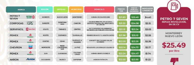 Cada día el precio de la gasolina tiene un aumento, por lo que es importante mantenerse informado para saber en dónde la venden más económico, ya que para los automovilistas y los motociclistas, el gasto de este consumo tiene un impacto significativo en sus bolsillos.De acuerdo con la Profeco, el precio promedio diario de la gasolina regular, premium y diésel oscilan entre los 22 y los 24 pesos por litro. De acuerdo con la investigación que hizo la Procuraduría Federal del Consumidor, la marca que la vende más económico es EXXON MOBIL por $22.19 pesos por litro en gasolina regular.Del 31 al 6 de agosto del 2023, la Profeco ha revelado cuáles son las marcas que venden la gasolina regular y premium más económica y más cara. En Jalisco, la gasolina regular en la gasolinera AKRON ubicada en Zapopan, en Avenida Patria 574 está a $23.99 en precio al público promedio está catalogada con los precios más altos. De acuerdo con el reporte, el precio de ganancia que tiene la empresa es del $1.22 pesos.Por su parte, en la Calzada Independencia 3869 en la gasolinera AKRON, la gasolina PREMIUM está a $25.99 pesos el litro en venta al público promedio.De acuerdo con la Profeco, los precios más bajos de la gasolina regular están fuera de la región Occidente. El precio más económico se encontró en Umán, Yucatán, a $21.59 pesos por litro.