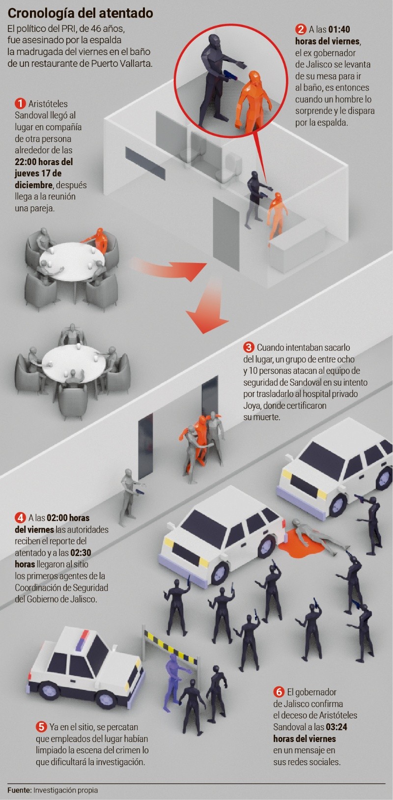 Aristóteles Sandoval Díaz, exgobernador de Jalisco, fue asesinado la madrugada de ayer en el baño de un bar de Puerto Vallarta.El actual mandatario de la Entidad confirmó el fallecimiento de su predecesor y ordenó que el gabinete de seguridad de trasladara al municipio costero. Más tarde agregó: “Lo que acabamos de vivir no sólo es un homicidio, es un desafío para el Estado mexicano”. Tras este hecho, el Presidente Andrés Manuel López Obrador (AMLO), miembros de la Iniciativa Privada (IP) y extitulares del Ejecutivo estatal lamentaron el ataque y exigieron esclarecer el homicidio.En su conferencia de prensa mañanera, López Obrador pidió una investigación y ofreció el apoyo de la Federación para encontrar a los responsables. El presidente de la Cámara de Comercio de Guadalajara (Canaco), Xavier Orendáin, condenó el magnicidio y llamó a que se investigue y se aplique la justicia. En el caso del dirigente de la Confederación Patronal de la República Mexicana (Coparmex) en Jalisco, Carlos Villaseñor, exhortó a reforzar la seguridad y a tener una mayor coordinación con las fuerzas federales. Por otra parte, los diputados locales guardaron tres minutos de silencio durante la sesión extraordinaria que se llevó a cabo ayer y condenaron la muerte del también ex alcalde tapatío. En un mensaje escrito, la familia de Sandoval Díaz dijo que el priista trabajó para transformar a la sociedad y supo que la violencia y la delincuencia son síntomas de un mal mayor: la falta de condiciones para tener una vida digna.“Desde la rabia y el dolor que hoy sentimos, les invitamos a no dejar que se apague el ímpetu que Aristóteles demostró cada día de su vida y lo llevemos en cada uno de nosotros, y que transformemos esa luz en la energía que necesitamos para acabar con la violencia que vive nuestro país”.