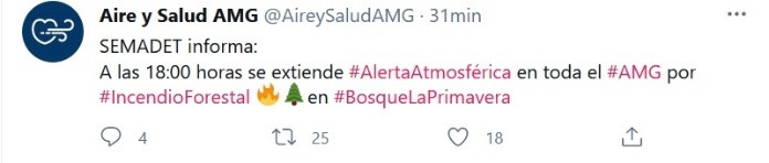 Una densa capa de humo cubre buena parte de la Zona Metropolitana de Guadalajara debido a un incendio que comenzó la noche del jueves pasado y que no ha podido ser controlado, por lo que se activó al inicio una alerta atmosférica desde las 6:00 de la mañana de este sábado para los municipios de Tala, Zapopan, Guadalajara y Tlajomulco de Zúñiga; sin embargo, durante la tarde se tomó la decisión de extender la alerta para toda el Área Metropolitana de Guadalajara (AMG).El incendio forestal inició en el paraje Ciudad Cajetes, dentro del bosque La Primavera, en el municipio de Tala tras caer un rayo en la copa de un árbol.Actualmente, el incendio es atendido por 268 elementos de la Secretaría de Medio Ambiente y Desarrollo Territorial (Semadet), la Unidad Estatal de a Protección Civil y Bomberos Jalisco (UEPCYBJ), los municipios de Zapopan, Tlajomulco de Zúñiga y Tala, el Organismo Público Descentralizado (OPD) Bosque La Primavera, la Comisión Nacional Forestal (Conafor), la Secretaría de la Defensa Nacional (Sedena), la Comisión Federal de Electricidad (CFE), las Juntas Intermunicipales de Medio Ambiente (JIMA) y Organizaciones No Gubernamentales (ONG).El incendio ha generado una gran cantidad de humo que por la dirección de los vientos se ha concentrado en parte del AMG, por lo que la Semadet activó la alerta atmosférica y pide a la ciudadanía atender las recomendaciones que emite la autoridad a través de canales oficiales.JM
