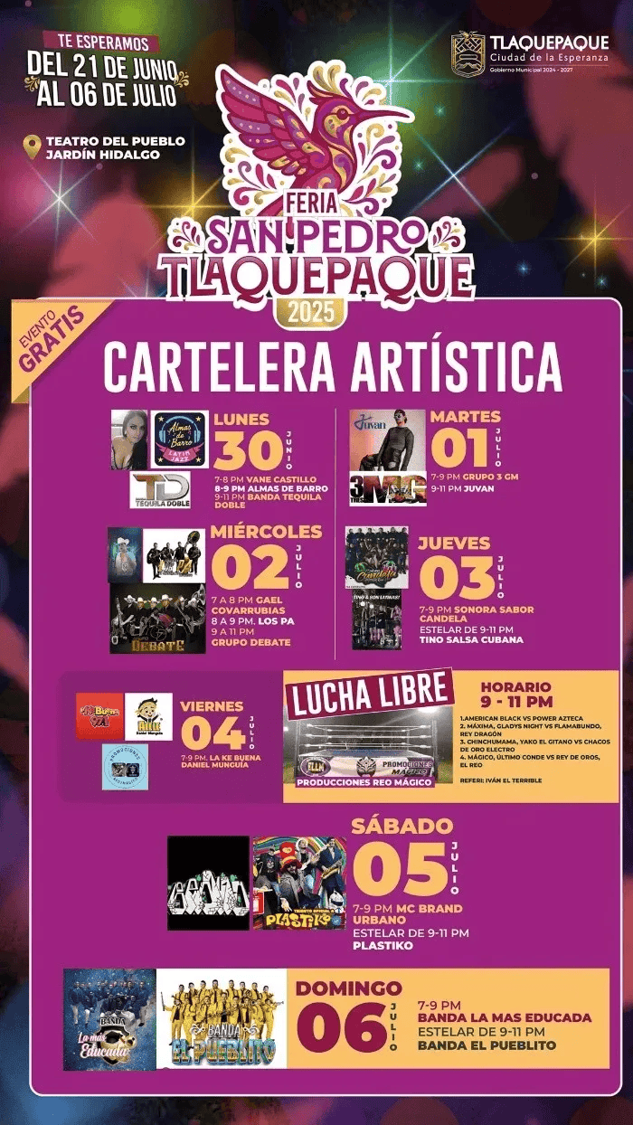 La Feria de San Pedro Tlaquepaque es una celebración que se realiza cada año y que destaca por su variada programación, la cual incluye espectáculos de comedia, presentaciones para niñas y niños, conciertos de talentos locales y actuaciones de artistas de renombre.Este evento anual comenzó a partir del 21 de junio y concluye el domingo 6 de julio, a lo largo de dos semanas, la feria ha contado con una cartelera interesante con presentaciones musicales de distintos generos hasta lucha libre y todo esto ha sido de forma gratuita en el jardín Hidalgo de San Pedro Tlaquepaque.La programación musical para estos últimos días garantiza horas de entretenimiento y buen ambiente para los asistentes. Si todavía no tienes planes para este fin de semana, una excelente opción es darte una vuelta por Tlaquepaque y disfrutar de todas las actividades que ofrece esta feria.Si eres de las personas que disfruta asistir a este tipo de eventos, no pierdas la oportunidad de asistir a la Feria de Tlaquepaque que además de música cuenta con juegos mecánicos, ventas artesanales y comerciales, una exposición ganadera y muchas sorpresas más. YC