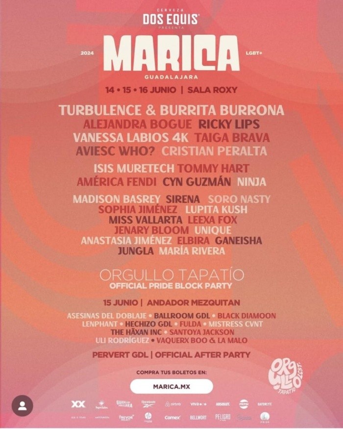 El mes del orgullo LGBT tiene consigo diversas actividades en la ciudad de Guadalajara, una de ellas será en un lugar icónico para la ciudad. El emblemático Roxy es una de las sedes principales para albergar el festival “Marica”, presentado por Dos Equis, el cual es uno de los eventos más esperados por los fanáticos de la cultura gay, quienes podrán disfrutar de una vibrante mezcla de música, baile, arte y performance.Alejandro Serratos, promotor del festival, asegura que este tipo de eventos en pro de la diversidad buscan ser un espacio inclusivo y creativo para toda la comunidad y sus aliados. “Como parte de los principios y valores de nuestra fundación Taller Ciudad, promovemos la diversidad sexual. Este festival es una iniciativa para recaudar fondos para un centro cultural comunitario LGBT en Guadalajara. Con Orgullo Tapatío, lanzamos este evento con grandes invitados para la reapertura del Roxy,” comentó Serratos. Los más de 30 artistas se presentarán durante los tres días del festival, incluyendo a Turbulence & Burrita Burrona, Alejandra Bogue, Ricky Lips, Vanessa Labios 4K, Taiga Brava, Aviesc Who?, Cristian Peralta, Isis Muretech, Tommy Hart, América Fendi, Cyn Guzmán, Ninja, Madison Basrey, Sirena, Soro Nasty, Sophia Jiménez, Lupita Kush, Miss Vallarta, Leexa Fox, Jenary Bloom, Unique, Anastasia Jiménez, Elbira, Ganeisha, Jungla y María Rivera.La historia de este lugar se remonta al año 1937, cuando fungía como cine de la ciudad y posteriormente en 1990 como Centro Cultural, ha sido escenario de más de mil espectáculos, incluyendo presentaciones de bandas icónicas como Mano Negra, Café Tacvba, Caifanes y Radiohead. En 2013, ante la amenaza de convertirse en un estacionamiento, Alejandro Serratos y Rogelio Flores se unieron para revivir el lugar.Si deseas acudir al festival se ofrecen dos tipos de boletos: General y Preferente, disponibles por mil 100 y mil 900 pesos respectivamente.Para más detalles y para adquirir boletos clic en el enlace.