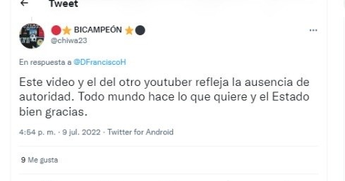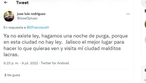 Debido a que hoy se dio a conocer un segundo cierre del Puente Matute Remus por parte de jóvenes que graban videos para subirlos a las redes sociales, tapatíos refirieron que es una burla para la autoridad que no supervisa este punto vial para evitar estos hechos.Ayer 8 de julio este medio publicó que el Tiktoker de nombre “Fofo” Márquez subió un video que se hizo viral donde se ve que cierra el paso del también conocido como Puente atirantado.“Fofo” muestra en su cuenta de TikTok cómo es que detuvo sus autos de lujo para evitar el paso de otros vehículos, y así obstruir el tráfico en una de las avenidas más importantes de la ZMG. “Pues vamos a cerrar, me voy a poner a bailar, a hacer TikToks. Entonces, pues bueno, para que vean otra vez lo que el dinero puede llegar a hacer aquí en México”, dijo Márquez en el video. En el segundo hecho, en un video subido también a redes sociales se ve a un hombre en el Puente Matute Remus que dice "venimos a contestarle el video a nuestro amigo 'Fofo' Márquez ya que dice que nomás él puede cerrar".En redes sociales, ciudadanos que vieron el video reaccionaron e hicieron comentarios criticando que el Gobierno no lleve a cabo acciones para evitar los cierres y que no hay sanciones para quienes lo hacen.El usuario de Twitter @chiwa23 señaló "este video y el del otro youtuber refleja la ausencia de autoridad. Todo mundo hace lo que quiere y el Estado bien gracias".Jose Luis Rodríguez @JoseOptuso coincidió: "Ya no existe ley, hagamos una noche de purga, porque en esta ciudad no hay ley. Jalisco, el mejor lugar para hacer lo que quieras ven y visita mí ciudad malditos lacras"."Lo que va a pasar es que como la vez anterior hablaron de la ausencia de "agentes de vialidad" y al día siguiente después de mucho tiempo ya había en los cruces que fueron señalados, aquí pasará igual, será temporal y luego todo a la normalidad, si ley pero haciendo bussines", dijo por su parte @LicTllez1.Otra persona arrobó la cuenta de la Secretaría de Seguridad de Jalisco, la cual tiene a su mando a la Policía Vial y señaló: "ya pongan orden, ¿no? Ya fueron 2 los idiotas cerrando el Matute Remus. ¿Cuándo chambean?La cuenta Sonríe Ciclista dijo a la Policía Vial: "Miren, sobre hacer algo es pedir mucho al gobernador, en especial y a sus agentes de @JaliscoVial. No pueden proceder con un niño... que se cree poderoso con el dinero de su papá, bloqueando el puente Matute Remus.GIDLEVSKAYAVLADIMIR @ALFREDOPARTID12 refirió a la publicación del segundo video: "Si no puede con el enemigo, únetele. Están ocupados con el operativo de gruas, ahí sí hay billete".