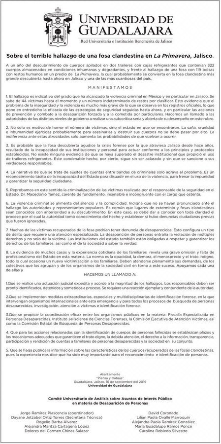 La fosa clandestina encontrada en La Primavera con 119 bolsas con restos humanos es señal de la incapacidad del Estado para disuadir en el uso de la violencia, para frenar la impunidad y para garantizar la seguridad, manifestó la Universidad de Guadalajara a través de un desplegado publicado este martes.En el documento, la casa de estudios reprobó la narrativa oficial de las autoridades, que han argumentado que muchas de las víctimas derivan de ajustes de cuentas entre bandas de criminales, justificación que solo agrava el problema."Reprobamos en este sentido la criminalización de las víctimas realizada por el responsable de la seguridad en el Estado, Dr. Macedonio Tamez, carente de fundamento, insensible e incongruente con el cargo que ostenta", aludió el desplegado a una declaración hecha por éste el pasado 12 de septiembre:"Esto no le va a gustar a algunos grupos, que muchos de los que hemos encontrado en fosas tienen antecedentes criminales, muchísimos, un buen porcentaje. (...) Para efectos de investigación y de sanción es un ser humano, lo lamentamos y se va a investigar, pero debo de decirlo como una inducción a la reflexión, para que los jóvenes mexicanos al leer esta noticia vean que meterse al crimen no paga".La Universidad recordó que muchos de los cuerpos corresponden a víctimas de desaparición, fenómeno que constituye una violación de numerosos derechos, no solo de la víctima, sino de los familiares. "La norma es la opacidad, la demora, el menosprecio y el trato indigno, todo lo cual ocasiona una nueva victimización".La universidad advierte que los hallazgos de tantos cadáveres son evidencia de que el problema de la violencia e inseguridad es mucho más grave de lo que se divulga de manera oficial. Además, manifestó su preocupación por que esto lleve a una nueva crisis forense como la vivida el año pasado con los tráileres con cuerpos.Con lo anterior, la universidad demandó reaccionar de acuerdo a la magnitud de los hallazgos y dar con los responsables; implementar medidas extraordinarias en las que intervengan organismos internacionales; aumentar la coordinación entre dependencias involucradas; y garantizar el trato digno de los cuerpos y el derecho a la información y la transparencia.Aunque Tamez declaró este martes que desconocía un comunicado oficial de la Universidad, la casa de estudios destacó que el desplegado era oficial, emitido por un Comité aprobado por el Consejo General Universitario el pasado 29 de agosto.La fiscal de Desaparecidos, Blanca Jacqueline Trujillo, justificó que no se busca criminalizar a las víctimas de desaparición."No es para denostar a las personas ni para causarles una afectación a su imagen o a su honorabilidad, sino para también darnos cuenta cómo está permeando el delito y sobre quién o quiénes son las personas que están resultando afectadas". OB