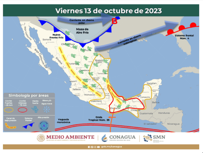El Servicio Meteorológico Nacional (SMN) informó sobre otro fenómeno natural de impacto nacional: un nuevo frente frío, el número 6.La fuente climática oficial del Gobierno de México señaló, a través de un aviso, que un frente frío al suroeste de Estados Unidos, en interacción con una línea seca al norte de Chihuahua y Coahuila y un canal de baja presión en el noroeste de México, ocasionarán fuertes rachas de viento en dichas regiones.El frente frío Núm. 6 se extenderá sobre el norte de México e interaccionará con un canal de baja presión en el noreste del país y la corriente en chorro subtropical, aunado a inestabilidad en niveles altos de la atmósfera, originarán chubascos con lluvias puntuales fuertes y rachas de viento de 60 a 70 km/h con posible formación de torbellinos en Coahuila, Nuevo León y Tamaulipas; además, la masa de aire frío asociada al frente propiciará un refrescamiento de las temperaturas y rachas de viento de 40 a 60 km/h en Sonora, Chihuahua y Coahuila.El frente frío Núm. 6 se desplazará rápidamente sobre el litoral del Golfo de México, oriente y sureste del país, generarán lluvias intensas a torrenciales en Puebla, Veracruz, Oaxaca, Chiapas y Tabasco, lluvias muy fuertes a puntuales intensas en Tamaulipas, San Luis Potosí e Hidalgo, lluvias puntuales fuertes en Nuevo León, Guanajuato, Querétaro, Estado de México, Ciudad de México, Morelos y Tlaxcala, y lluvias aisladas con chubascos en Chihuahua, Coahuila, Durango, Aguascalientes y Zacatecas.Dichas lluvias estarán acompañadas de descargas eléctricas y posible caída de granizo; además, las lluvias, a partir de fuertes, podrían originar visibilidad reducida, deslaves, encharcamientos o inundaciones, así como incremento en los niveles de ríos y arroyos.La masa de aire frío que se le asocia al frente, ocasionará evento de "Norte" con rachas de viento de 60 a 80 km/h y oleaje de 2 a 4 metros de altura en el litoral de Tamaulipas y Veracruz. Además, se prevé un descenso de la temperatura en las entidades de la Mesa del Norte y Mesa Central.El frente Núm. 6 se desplazará sobre el sureste del país y gradualmente sobre la Península de Yucatán, ocasionará lluvias intensas a puntuales torrenciales en Veracruz, Oaxaca, Chiapas y Tabasco, lluvias muy fuertes a puntuales intensas en Puebla, Campeche y Yucatán, lluvias muy fuertes en Hidalgo y Quintana Roo, lluvias puntuales fuertes en San Luis Potosí, Querétaro, Estado de México, Ciudad de México, Morelos y Tlaxcala, así como lluvias aisladas con chubascos en Chihuahua, Coahuila, Nuevo León, Tamaulipas, Durango, Zacatecas, Aguascalientes y Guanajuato.Dichas lluvias estarán acompañadas de descargas eléctricas y posible caída de granizo; además, las lluvias, a partir de fuertes, podrían originar visibilidad reducida, deslaves, encharcamientos o inundaciones, así como incremento en los niveles de ríos y arroyos.La masa de aire frío que se le asocia al frente, ocasionará evento de "Norte" con rachas de viento de 70 a 90 km/h en el Istmo de Tehuantepec, con oleaje de 2 a 4 metros de altura en el litoral de Veracruz y Golfo de Tehuantepec; y con rachas de 40 a 60 km/h y oleaje de 1 a 2 metros de altura en el litoral de Tamaulipas, Tabasco, Campeche y Yucatán. Además, se prevé descenso de la temperatura y bancos de niebla en las entidades del oriente y sureste del país.Viernes 13 de octubre:Temperaturas mínimas de 0 a 5 °C para la madrugada del sábado: sierras de Sonora, Chihuahua, Durango, Michoacán, Estado de México, Hidalgo, Tlaxcala y Puebla.Sábado 14 de octubre:Temperaturas mínimas de 0 a 5 °C para la madrugada del domingo: sierras de Sonora, Chihuahua, Durango y Estado de México.Domingo 15 de octubre:Temperaturas mínimas de 0 a 5 °C para la madrugada del lunes: sierras de Chihuahua, Durango, Querétaro, Hidalgo, Tlaxcala, Estado de México y Puebla.Con información Servicio Meteorológico NacionalOA