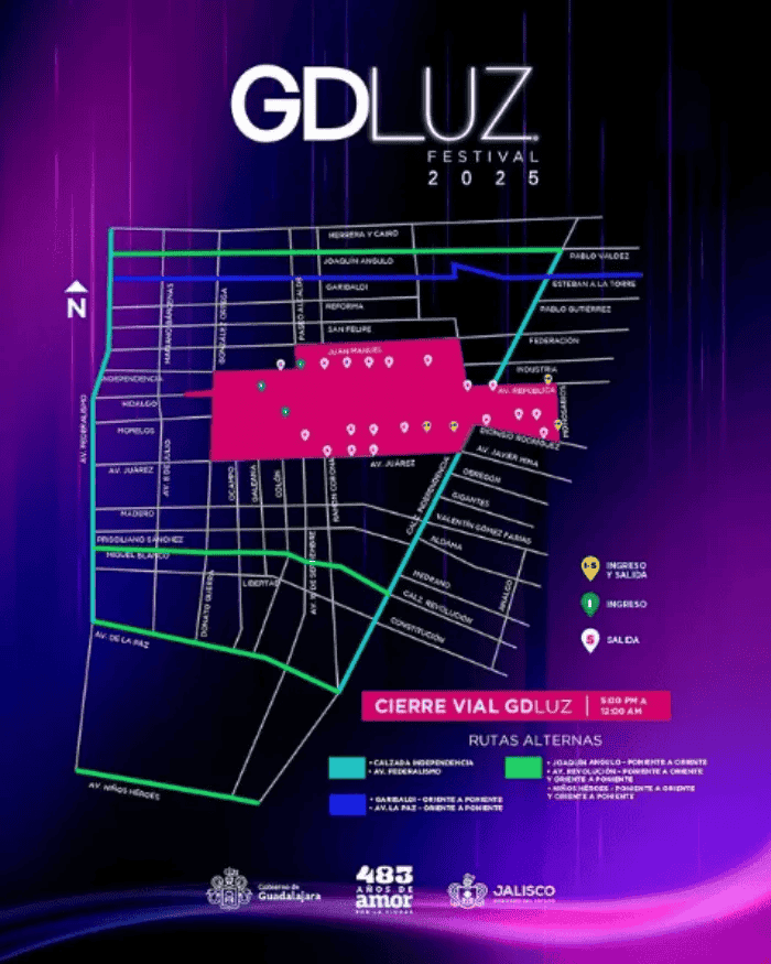 El festival GDLUZ 2025 siempre es uno de los eventos más esperados en Guadalajara con el cual se conmemora el 483 aniversario de la ciudad llenando el Centro Histórico de espectáculos musicales, luces y arte digital.Este año el festival de luces consta de una duración de 5 días, del 12 al 16 de febrero y con el objetivo de garantizar la seguridad de los asistentes y el correcto desarrollo del evento se han implementado algunos cierres viales en diversas calles principales del corazón de la ciudad.Las restricciones viales por GDLUZ estarán diariamente durante el festival desde las 17:00 hasta las 00:00 horas y cubren una zona amplia que incluye calles como Juan Manuel, avenida Juárez, Dionisio Rodríguez, avenida República, Monosabios, Paseo Alcalde, Independencia y González Ortega.No obstante, tanto los organizadores como el Gobierno de Guadalajara han compartido desde el inicio de este festival un mapa con las rutas alternas que los conductores pueden tomar para evitar complicaciones viales y retrasos a sus destinos.Las rutas alternas ante el cierre de las vialidades por el festival que se realiza de 5 de la tarde a medianoche son la Calzada Independencia, avenida Federalismo, Garibaldi, avenida La Paz, Joaquín Angulo, avenida Revolución, y Niños Héroes.Por otra parte, si planeas visitar el Centro Histórico para disfrutar de este festival de luces, toma en cuenta que el ingreso a este puede ser desde el Hospicio Cabañas pasando por Plaza de la Liberación y la Rotonda de los Jaliscienses Ilustres hacia la Catedral de Guadalajara o viceversa.Las autoridades también brindan las siguientes recomendaciones con el objetivo de que citadinos y turistas puedan vivir una mejor experiencia:El evento contará con vigilancia en los accesos, módulos de atención médica y personal capacitado para responder ante cualquier emergencia. YC