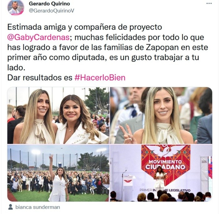 Impulsar una red de personas cuidadoras que sean no solo recompensadas, sino reconocidas y capacitadas para su labor, es parte de las iniciativas en las cuales se ha enfocado la diputada del Distrito 06 local, Gabriela Cárdenas.“Impulsamos la creación del sistema de cuidados en Jalisco para que nuestro Estado sea el único en todo el País en reconocer y cuidar a quienes cuidan, para ver cómo repartimos todas las tareas en la sociedad, cómo avanzamos hacia la corresponsabilidad y en esto todos podemos aportar. Quiero que el Estado sea un ejemplo, así como se logró en Zapopan teniendo el primer sistema municipal de cuidados único en todo el país”, dijo la diputada Gaby en la presentación de su primer informe de actividades.Cumplirlo, señaló, será un legado para la Entidad que se sumará a la Red Global de los Cuidados, poniendo el nombre de Jalisco un paso adelante.También señaló que durante su primer año de labores en el Congreso de Jalisco ha trabajado y votado para lograr reformas como la hecha al Código Penal estatal para incrementar las penas al abuso sexual infantil, se aprobó de la mano de las mujeres empresarias la igualdad laboral salarial sustantiva sin discriminación para las mujeres y se estableció la obligación de registrar a las y los recién nacidos de manera inmediata “para hacer valer su derecho a la identidad, pero también para evitar que sean víctimas de trata, explotación infantil y robo".También, dijo, trabajó por rescatar las escuelas de tiempo completo, mientras que a la par se trabajó con los municipios para impulsar programas de apoyoy aquellas personas que lo requieren puedan echarse mano de las estancias particulares.En el ámbito del medio ambiente, también se ha enfocado en promover incentivos fiscales para llevar energías limpias y aprovechar los recursos naturales, como el agua, en casa y empresas, además de modificar las leyes municipales para que los municipios incidan en el retiro de árboles peligrosos.También, aseveró, trabaja por generar una mejor movilidad en la zona de Tesistán, a fin de tener transporte público de calidad en aquella zona.No queda de lado el avance en la nueva Ley Inmobiliaria, para lo cual se han impulsado diversas mesas de trabajo a fin de lograr este recurso con el cual se evitarán fraudes en la compra-venta de inmuebles.En total la diputada, ha presentado 15 iniciativas como autora y ocho como coautora. Del total, añadió, el 71% ya han sido aprobadas. También se lograron 22 acuerdos legislativos y al menos 350 gestiones documentadas.“Pero más allá de integrar propuestas en las oficinas del Palacio Legislativo, la agenda del legislador debe priorizar la cercanía con las comunidades, pero también hacer un llamado permanente a los sectores organizados, a fin de fortalecer las causas sociales en todos los niveles y lograr respuestas mediante el trabajo colaborativo”, expresó la diputada.Acompañada de vecinas y vecinos de distintas colonias de su distrito, así como de personajes como los alcaldes de Zapopan y Guadalajara, Juan José Frangie y Pablo Lemus, así como de compañeras y compañeros de su bancada en el Congreso, Gaby Cárdenas presentó su primer informe de actividades en el Parque de las niñas y los niños, en Zapopan.Ahí la diputada por Movimiento Ciudadano dedicó este ejercicio a su hijo Rodrigo, por quien dijo trabaja todos los días, sin dejar de lado a todas y cada una de las personas quienes votaron por ella, pues dijo, es gracias a su confianza que hoy ha podido regresar a darles muestra de los primeros resultados por los cuales labora en conjunto.Durante el evento, la diputada también agradeció también a todas y todos los integrantes del partido, tanto municipales, como locales y federales quienes la impulsaron y quienes la han acompañado en el trabajo de este su primer año, y con quienes ha logrado trabajar las distintas agendas, especialmente de la red de sistema de personas cuidadoras.Por último, agradeció a la red de integrantes de las cámaras y la sociedad, así como a la ciudadanía en general, pues dijo, es en conjunto que se ha trabajado para poder tener un mejor Jalisco para todas y todos, y así continuará hasta lograr ver aprobadas sus propuestas en favor de la ciudadanía.JM