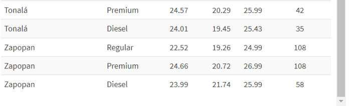 El Instituto de Información Estadística y Geográfica de Jalisco (IIEG), detalla los precios de combustible en el los municipios de la Zona Metropolitana de Guadalajara (ZMG).En este portal, puedes consultar los precios de combustible de los seis principales municipios: Guadalajara, Tlajomulco, Tlaquepaque, Tonalá, Zapopan y El Salto. La información presentada, se actualiza de manera diaria por las mañanas con información de la Comisión Reguladora de Energía (CRE), por lo que esta información corresponde a los precios de este lunes 15 de abril de 2024.En esta sección de la página del IIEG, podrás encontrar el precio promedio diario de la gasolina (regular, premium y del diésel), el precio promedio por municipio y los precios de estos tres tipos de combustible.*Mantente al día con las noticias, únete a nuestro canal de WhatsApp aquí: https://whatsapp.com/channel/0029VaAf9Pu9hXF1EJ561i03MV