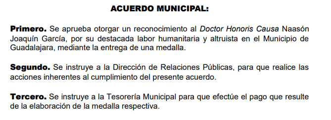 El Ayuntamiento de Guadalajara notifica a través de redes sociales que cancela los planes de entregar una medalla a Naasón Joaquín García, líder de la iglesia La Luz del Mundo que esta semana fue detenido en Estados Unidos acusado de delitos de trata de personas y abuso sexual."El pleno del Gobierno de Guadalajara no tenía conocimiento de las acusaciones en contra de Naasón Joaquín García al momento de aprobar el otorgamiento de un reconocimiento. La entrega de esta distinción queda suspendida", es el mensaje que difunden en respuesta a comentarios de los usuarios de redes.El acuerdo ahora cancelado, había sido plasmado en la Gaceta Municipal con fecha del 17 de mayo de este año tras la discusión en el cabildo un día antes. A la letra dice: "Se aprueba otorgar un reconocimiento al Doctor Honoris Causa Naasón Joaquín García, por su destacada labor humanitaria y altruista en el Municipio de Guadalajara, mediante la entrega de una medalla".