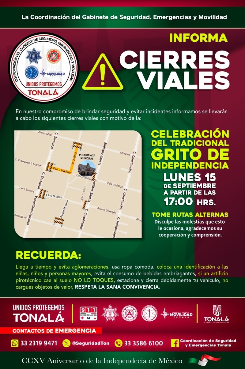 La Coordinación de Seguridad y Emergencias de Tonalá dio a conocer los cierres viales que habrá en el municipio el lunes 15 de septiembre con motivo de la celebración del tradicional Grito de Independencia.El día de mañana, el presidente municipal Sergio Chávez encabezará el festejo por los 215 años de la Independencia de México desde la Plaza Cihualpilli.En ese lugar, a partir de las 17:00 horas, se podrá gozar de un programa musical en donde destaca la participación de Chuyin Barajas. De acuerdo con el Gobierno municipal, estos son los horarios y los artistas que se presentarán: De acuerdo con la información compartida por autoridades tonaltecas, los cierres a la circulación se realizarán en vialidades aledañas a la Presidencia Municipal: La Coordinación de Seguridad y Emergencias de Tonalá emitió una serie de recomendaciones para las personas que planean asistir al Grito de Independencia en el municipio:* * * Mantente al día con las noticias, únete a nuestro canal de WhatsApp * * *MB