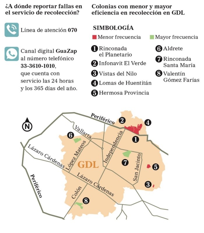 La recolección de basura ha afectado a colonias de Guadalajara durante los últimos días de la administración actual.La Coordinación de Servicios Públicos Municipales del Ayuntamiento de Guadalajara informó que durante el último mes las colonias con menor frecuencia en la recolección de residuos sólidos en el municipio tapatío son Rinconada El Planetario, Infonavit El Verde, Vistas del Nilo, Lomas de Huentitán y Hermosa Provincia.En contraparte, las colonias con mayor frecuencia en la recolección de residuos sólidos en este mes son El Porvenir, Javier Mina, Aldrete, Rinconada Santa María y Valentín Gómez Farías.Ana, vecina de la colonia Rinconada El Planetario, comentó que han batallado: “Han pasado muy poco en las últimas semanas, ya casi no ha pasado aquí y en varias calles cercanas”.El pasado 19 de septiembre, la alcaldesa electa de Guadalajara, Verónica Delgadillo, anunció que no renovará la concesión a la empresa Caabsa Eagle, cuyo contrato vence en diciembre; al respecto, Gerardo Bernache, académico e investigador del CIESAS, estima que el problema pueda continuar durante el final del año, así como a principios del siguiente.“Habrá una etapa de transición en la que pueda caer el servicio, esto cuando deje Caabsa y cuando empiece Guadalajara a tomar las riendas de la recolección, esto por la falta de experiencia y porque no hay suficientes camiones”.Por ello, sugirió que se retome la idea del gobernador electo de Jalisco, Pablo Lemus, para establecer de manera formal la Agencia Metropolitana de Gestión de Residuos; el mandatario sugirió a los municipios de Guadalajara, Tonalá, Tlajomulco de Zúñiga y El Salto no renovar las concesiones.Por otra parte, María Azucena Arellano Avelar, jefa del Departamento de Sustentabilidad y Ciencias del Territorio del CuTlajomulco de la UdeG, opinó que debe fomentarse la cultura del reciclaje e impulsar la creación de rellenos sanitarios para no enfocarse sólo en la recolección de basura, recordando que los que existen actualmente ya cumplieron su ciclo de vida.Por lo pronto, en Lomas de Huentitán, vecinos reclamaron que tienen basura acumulada y comentan que personas la avientan y que el camión de la basura tarda, y cuando pasa, no se la lleva: “Se supone que vienen en la tarde, pero tardan días, no pasa y ya ahí se queda, apestando”, dijo Juan.También alertan por la presencia de basura que puede convertirse en focos de infección de enfermedades y acumulación de plagas, en este caso, por el repunte de casos de dengue.“Casi no pasa, tarda mucho en pasar y ahorita hay brote de dengue, con el basurero pues con mayor razón (hay riesgo de contagio). Si bien nos va, pasa cada semana o menos”, dijo Graciela, vecina de la colonia Del Fresno.En dicha colonia también es constante la presencia de bolsas de basura en la calle, por ejemplo, en Olmo y Ciprés, donde se acumulan los residuos en lo que antes eran las vías del tren que conectaban con avenida Washington. En la calle Olmo, Valeria cuida a su hijo para que no se caiga en los montones de basura acumulados: “Dependiendo, pasa por unas calles y se lleva la basura, pero otras veces no. Máximo una o dos veces a la semana”, mencionó.En las últimas semanas, el servicio se desplomó al 60% en la cobertura, aceptó el alcalde interino, Francisco Ramírez Salcido, afectando a las colonias mencionadas.