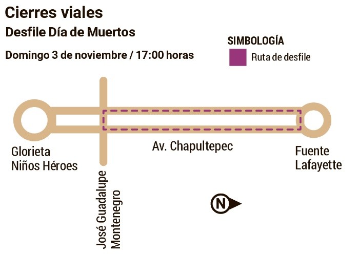 Este domingo seguirán las actividades relacionadas con la festividad del Día de Muertos en Guadalajara.En punto de las 17:00 horas, se llevará a cabo un desfile por el Día de Muertos en la colonia Americana de Guadalajara, por lo que la Comisaría de la Policía Vial y el Gobierno de Jalisco reiteraron las actividades para informar a la ciudadanía sobre cierres viales en la zona.Se prevé que este desfile inicie alrededor de las 17:00 horas y su recorrido principal será por la avenida Chapultepec, desde la calle José Guadalupe Montenegro con rumbo hacia la avenida México. Los sentidos de circulación de la avenida estarán cerrados debido al paso del contingente que es convocado y organizado por el municipio de Guadalajara.Además, habrá un escenario sobre el andador Chapultepec a la altura de la calle Libertad el cual contará con distintas presentaciones artísticas, esto en un horario establecido desde las 4 de la tarde a las 10 de la noche.La Policía vial exhorta a la población a tomar precauciones, anticipar sus tiempos de traslado, tomar vías alternas y respetar las indicaciones de las y los oficiales que estarán a lo largo del trayecto.La dependencia invita a consultar más información a través de sus redes sociales. YC