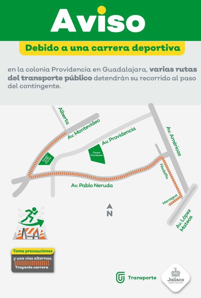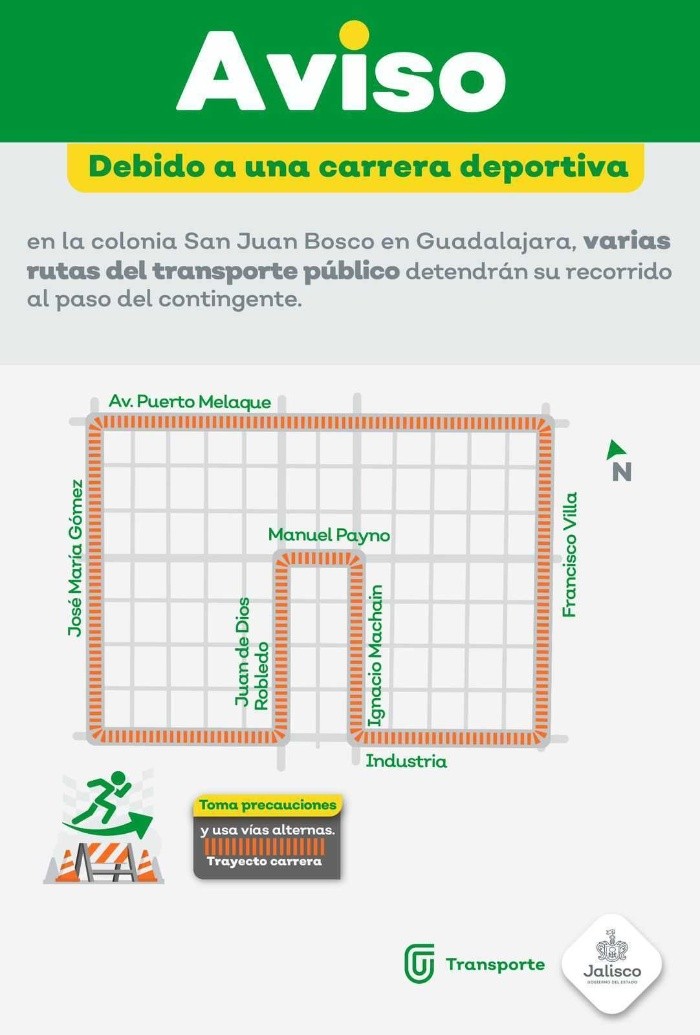 Debido a tres carreras deportivas a realizarse en Guadalajara, varias rutas del transporte público detendrán su recorrido a partir de las 07:00 horas de mañana domingo 10 de septiembre, en los que pasa el contingente de corredores. Los eventos serán en las Colonias San Juan Bosco, Vallarta Poniente y Providencia.Para que te prepares y tomes tus precauciones, te compartimos el reporte del Gobierno estatal acerca de los cambios:En la colonia San Juan Bosco el contingente de corredores saldrá de la calle Industria, a un costado de la parroquia de la zona, en dirección hacia el poniente y dará vuelta a la derecha en la calle José María Gómez; continuará hasta llegar a la avenida Puerto Melaque donde girará a la derecha y al llegar a la calle Francisco Villa dará vuelta a la derecha para continuar en dirección al sur y llegar nuevamente a la calle Industria; girará a la derecha hasta Ignacio Machain, después tomará la calle Manuel Payno hacia el poniente y al llegar a Juan de Dios Robledo girará a la izquierda y seguirá hasta la calle Industria en donde darán vuelta hasta encontrarse con la meta.Las rutas C22 y Sitren L3 (trolebús) se detendrán en la calle Industria, de Francisco Villa a José María Gómez, en sentido de oriente a poniente.En av. Puerto Melaque, de José María Gómez a Francisco Villa, en sentido de poniente a oriente, lo harán las rutas C07, C22 y C71, mientras que las rutas C08, C69, T18 López Mateos y T18 Terranova, se detendrán en Juan de Dios Robledo, de Manuel Payno a Industria en sentido de norte a sur.La carrera en la colonia Vallarta Poniente tendrá como salida y meta un punto frente a la Gran Plaza, sobre avenida Vallarta.Los participantes en esta competencia partirán de la lateral de avenida Vallarta hacia el oriente y se retornarán en la calle Isabel La Católica por la misma avenida Vallarta en dirección al poniente y al llegar a Juan Palomar y Arias darán vuelta a la derecha hasta la calle Leónidas, donde se regresarán por la misma vía para dar nuevamente vuelta a la derecha en avenida Vallarta para seguir hasta la avenida Niño Obrero y ahí girarán hacia el sur hasta la avenida Lázaro Cárdenas, luego se retornarán por la misma en dirección a la avenida Vallarta, para nuevamente girar a la derecha hasta llegar a la meta.Las rutas que detendrán su recorrido de forma momentánea en la avenida Ignacio L. Vallarta, de av. Niño Obrero hacia Isabel La Católica en ambos sentidos, serán las C70 Las Águilas, C109, C110 dos vías, 710 Parques-Palermo y Sitren L1.Para esta carrera en la colonia Providencia el punto de salida y meta será la calle Managua, desde donde el contingente de corredores se dirigirá hacia el oriente, en el sentido de la circulación vehicular, dará vuelta a la izquierda por la calle Filadelfia hasta av. Pablo Neruda y luego de circular por ésta, dará vuelta a la izquierda y continuará por Avenida Montevideo hasta la calle Alberta, donde dará vuelta en “u” para regresar por av. Montevideo hacia el poniente, seguirán por ésta última hasta la av. Pablo Neruda en donde seguirá y en la calle Filadelfia dará vuelta a la derecha para luego retomar la calle Managua hasta encontrarse con la meta.Las rutas que detendrán su recorrido de forma momentánea en Avenida Pablo Neruda, de Filadelfia hacia Avenida Montevideo en ambos sentidos, son la C54, C64, C65 y T08-C01."La Secretaría de Transporte agradece la comprensión e invita a las y los usuarios a planificar con antelación sus traslados, en caso de que usen las rutas mencionadas", agregó.OF