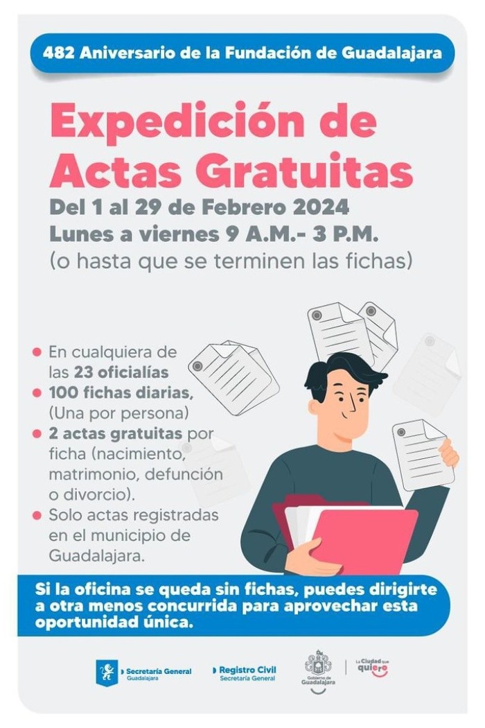 El gobierno de Guadalajara realizará por tercera ocasión su campaña anual de actas gratuitas, la cual se realizará del 1 al 29 de febrero, en las oficialías del Registro Civil Municipal.Durante dicho mes se repartirán 100 fichas diarias en cada una de las oficialías del Registro Civil de Guadalajara; con cada ficha la persona interesada podrá obtener dos actas gratuitas.Esta campaña de expedición de actas gratuitas es con motivo del 482 Aniversario de la Fundación de la Perla Tapatía.“Es un beneficio importante, cada acta vale 99 pesos, en razón de que si tres integrantes de una familia necesitan hacer un trámite, pues casi es un ahorro de 300 pesos que lo podían aprovechar en otro beneficio”, agregó el Director de Registro Civil en funciones de Secretario General.En un horario de 9:00 a 15:00 horas, se entregará una ficha por persona con la que podrán obtener dos actas gratuitas de actos registrados en el municipio de Guadalajara, como nacimiento, matrimonio, defunción y divorcio.Durante la primera edición de esta campaña se entregaron 39 mil actas, mientras que el año pasado dicha entrega se duplicó a 76 mil 300 actas, por lo que se espera que este año se iguale o incluso incremente el número de beneficiarios.NA