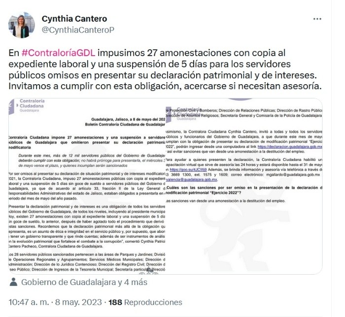 Ante la omisión en la entrega de su declaración de situación patrimonial y de intereses modificatoria 2021, la Contraloría Ciudadana de Guadalajara impuso 27 amonestaciones públicas y una suspensión de cinco días sin goce de sueldo a servidores públicos.Por medio de un comunicado, la titular de la Contraloría Ciudadana, Cynthia Cantero Pacheco, informó que de acuerdo a la Ley General de Responsabilidades Administrativas de Jalisco, funcionarios públicos están obligados a presentar sus declaraciones en periodo del mes de mayo del año pasado.Apuntó que representa un asunto de ética e integridad en el servicio público, además de que abona a tener un gobierno transparente y con rendición de cuentas que combate a la corrupción.Invitó a los trabajadores municipales a presentar su declaración anual con respecto a 2022, en este mes de mayo y así evitar sanciones que van desde una amonestación hasta la destitución del empleo.Los servidores públicos sancionados pertenecen a áreas de Parques y Jardines; División de Operaciones Regionales y Agrupamientos; Servicios Médicos Municipales; Dirección de Administración; Dirección de lo Jurídico Contencioso; Dirección del Registro Civil; Dirección de Aseo Público; Dirección de Ingresos de la Tesorería Municipal; Secretaría Particular; Dirección de Protección Civil y Bomberos; Dirección de Relaciones Públicas; Dirección de Rastro Público; Dirección de Asuntos Religiosos; Secretaría General; y la Comisaría de la Policía de Guadalajara.JM