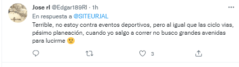 Este domingo 19 de diciembre se lleva a cabo la carrera ciclista L'Etape Guadalajara-Zapopan del Tour de France en la que están participando alrededor de mil ciclistas, de entre 18 y 65 años, en 10 categorías. En el transcurso de la carrera se llevarán a cabo controles de paso que garanticen la perfecta regularidad de todas y todos los participantes a fin de obtener un desarrollo óptimo de la misma. Cabe destacar que este circuito se está llevando a cabo durante un domingo lluvioso y con bajas temperaturas.Este importante evento deportivo ha ocasionado cierres viales en distintas avenidas de la Zona Metropolitana de Guadalajara (ZMG) que ha ocasionado caos vial y quejas entre los tapatíos. Autoridades recomiendan a los automovilistas tomar vialidades alternas para evitar tráfico, sin embargo, esto no ha evitado la molestia entre los conductores.Por su parte, el Siteur informó la mañana de hoy domingo que la Línea 1 del Tren Ligero no está operando debido a la carrera, además la ruta C98 del transporte público solamente llega hasta la Calzada Independencia.Como suele ocurrir durante estos eventos, ciudadanos reclaman a las autoridades falta de planeación y también piden mayor organización por parte de la Policía Vial.GC