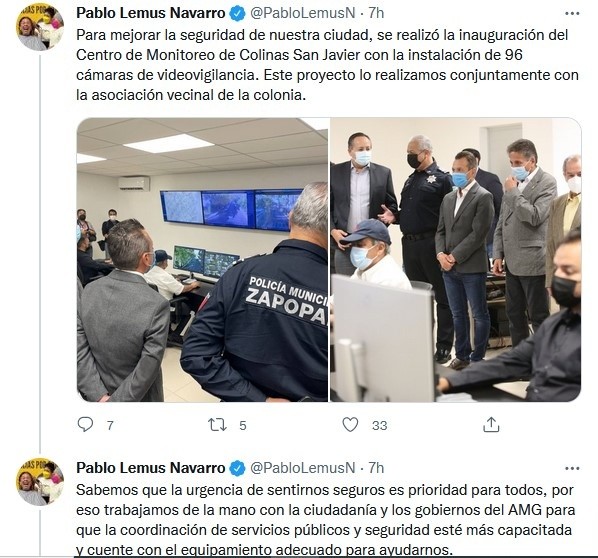 La alianza intermunicipal estratégica entre Guadalajara y Zapopan se vinculan de nueva cuenta para presentar un nuevo centro de monitoreo habilitado en la colonia Colinas de San Javier que les corresponde a ambos municipios.Los alcaldes de los dos Ayuntamientos, Pablo Lemus y Juan José Frangie, estuvieron presentes en la presentación.“Cuando circulan, cuando caminan, cuando salen a hacer ejercicio no les importa si están en Zapopan o en Guadalajara, lo que quieren es sentirse seguros, tener buenos servicios públicos, tener espacios verdes, etcétera”, dijo Lemus.El esfuerzo de la colocación de este centro de monitoreo fue en parte por los colonos de Colinas de San Javier, así lo destacó Frangie.“En la parte de seguridad nos damos cuenta cómo hay colonias, ciudadanos que están pendientes del trabajo y nos apoyan. Solos no podemos. Nosotros como gobierno en todos los temas necesitamos la colaboración de las y los ciudadanos”, aseguró.Este centro de monitoreo forma parte del sistema de videovigilancia de dicha colonia. La inversión se autorizó por parte de la Asamblea General de Asociados durante el ejercicio 2021 para la ampliación y modernización de las instalaciones, así como el equipamiento del área de seguridad y vigilancia para contar con un centro profesional de monitoreo y tecnología de punta.Esta base colaborativa cuenta con 96 cámaras fijas y móviles para la videovigilancia de la colonia. Además, cuenta con servidores y grabadores para el control y visualización de estas cámaras, controladoras para la proyección de imágenes y mapas.Este espacio también tiene tres monitoristas y un cabinero para la recepción de reportes y su derivación y atención por parte de las corporaciones policiales municipales.Armando Rimoldi Rentería, presidente del Consejo Directivo de Colinas de San Javier A.C, se mostró satisfecho por culminar este proyecto para su colonia.“Este día estamos concluyendo con la instalación completa de todas las cámaras que estaban en el diseño original. Hoy en día tenemos 91 cámaras de nosotros y monitoreamos también cinco cámaras de la periferia de la colonia, ya tenemos 96 cámaras; sin lugar a dudas, este es el servicio que más aprecian los colonos, la seguridad”, expresó.En el evento estuvieron jefes operacionales de las comisarías de Zapopan y Guadalajara, quienes se coordinaran con el centro de monitoreo de Colinas de San Javier para evitar delitos.JM